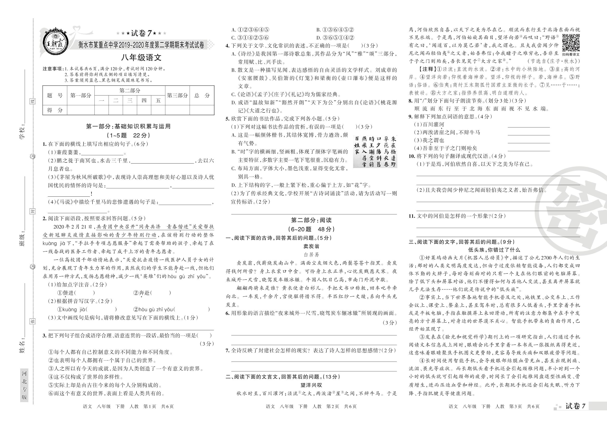 2019-2020学年第二学期衡水市八年级语文试卷(人教版)【7】