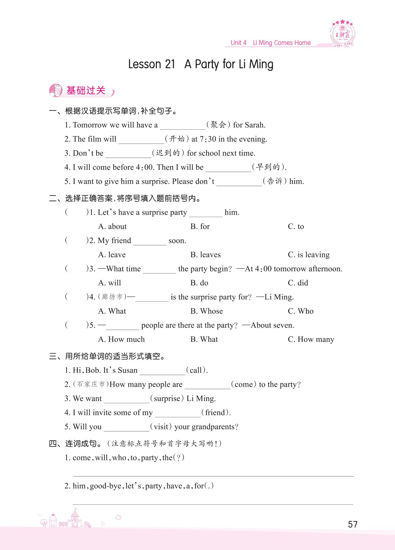 2022下册六年级英语冀教版 Unit 4—Lesson 21 A Party for Li Ming