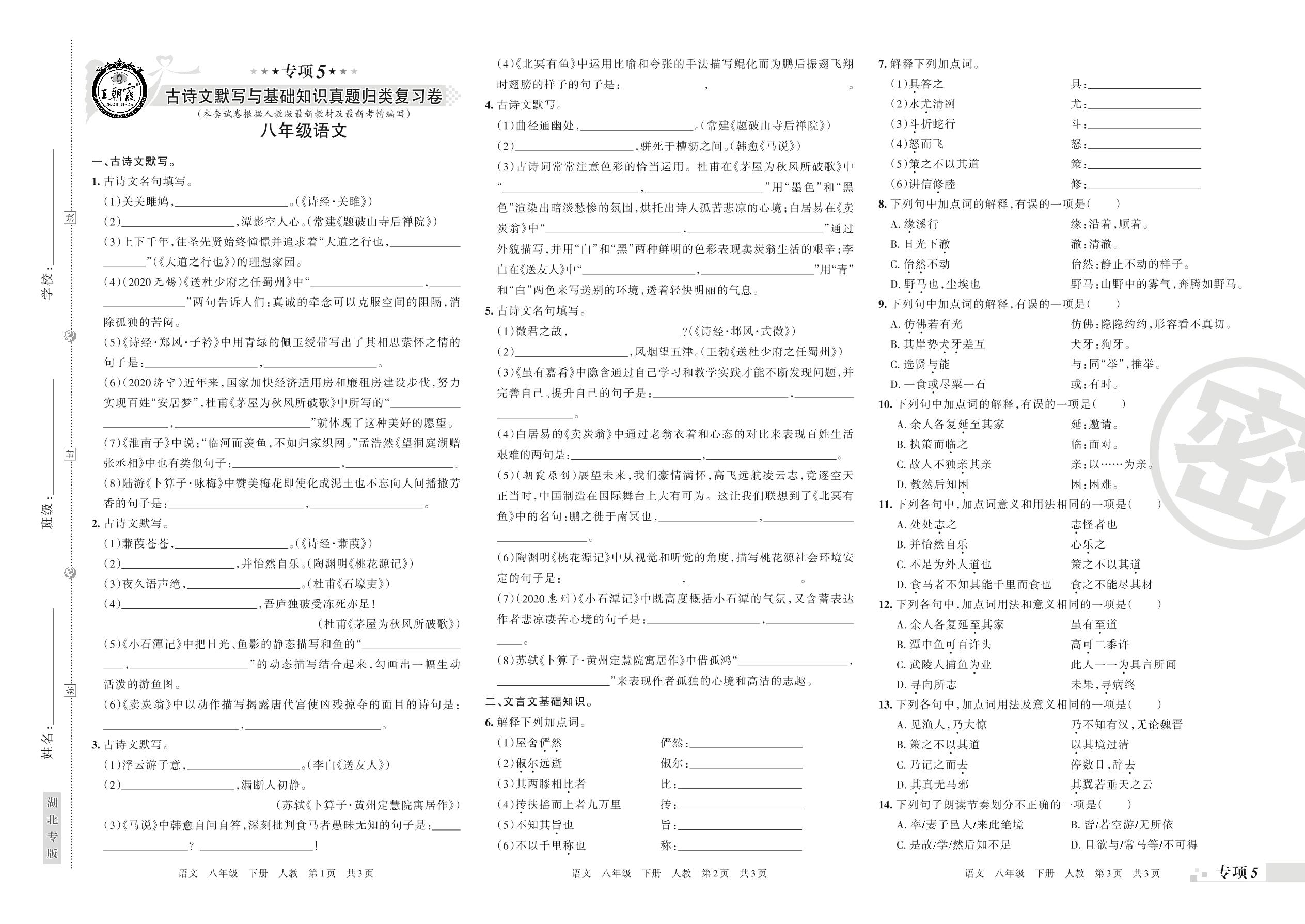 王朝霞期末专项卷——古诗文默写与基础知识、古诗词阅读真题归类复习八年级下册语文(人教版)_R2108023333【0】