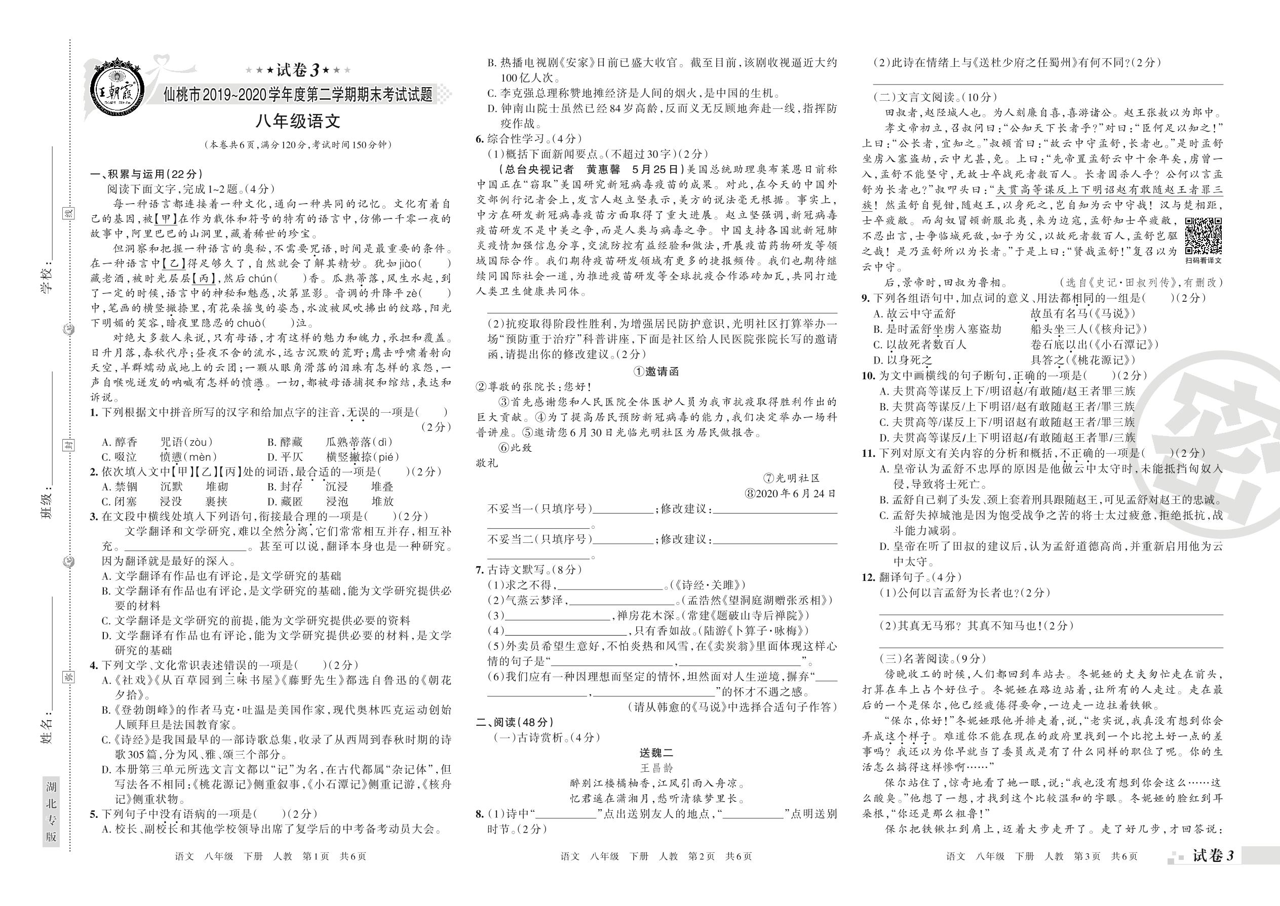 2019-2020学年第二学期仙桃市八年级语文试卷(人教版)【3】