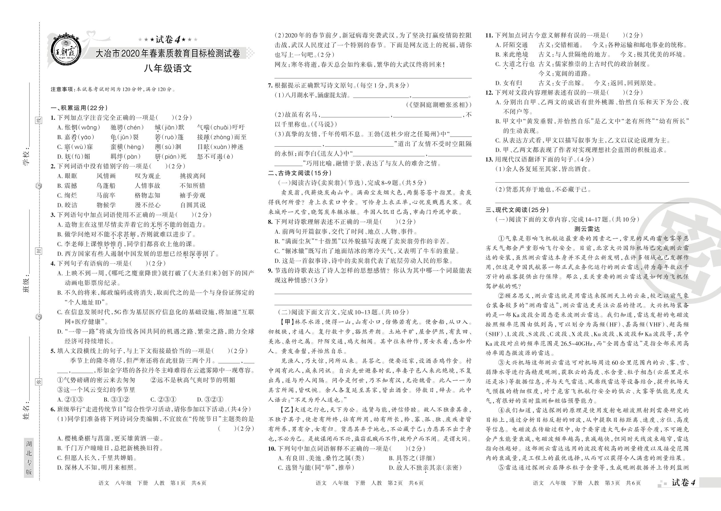 2019-2020学年第二学期大冶市八年级语文试卷(人教版)【4】