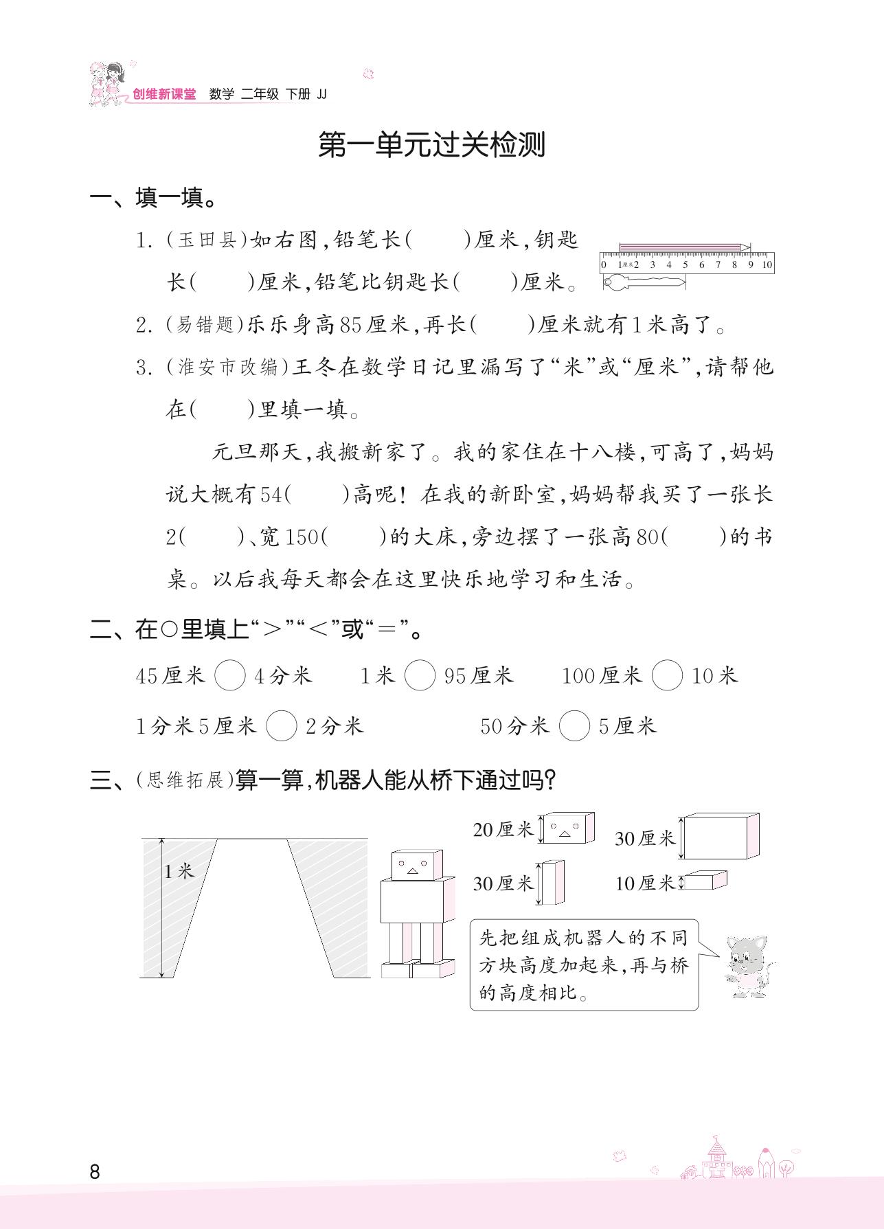 2022下册二年级数学冀教版 一 厘米、分米、米——第一单元过关检测