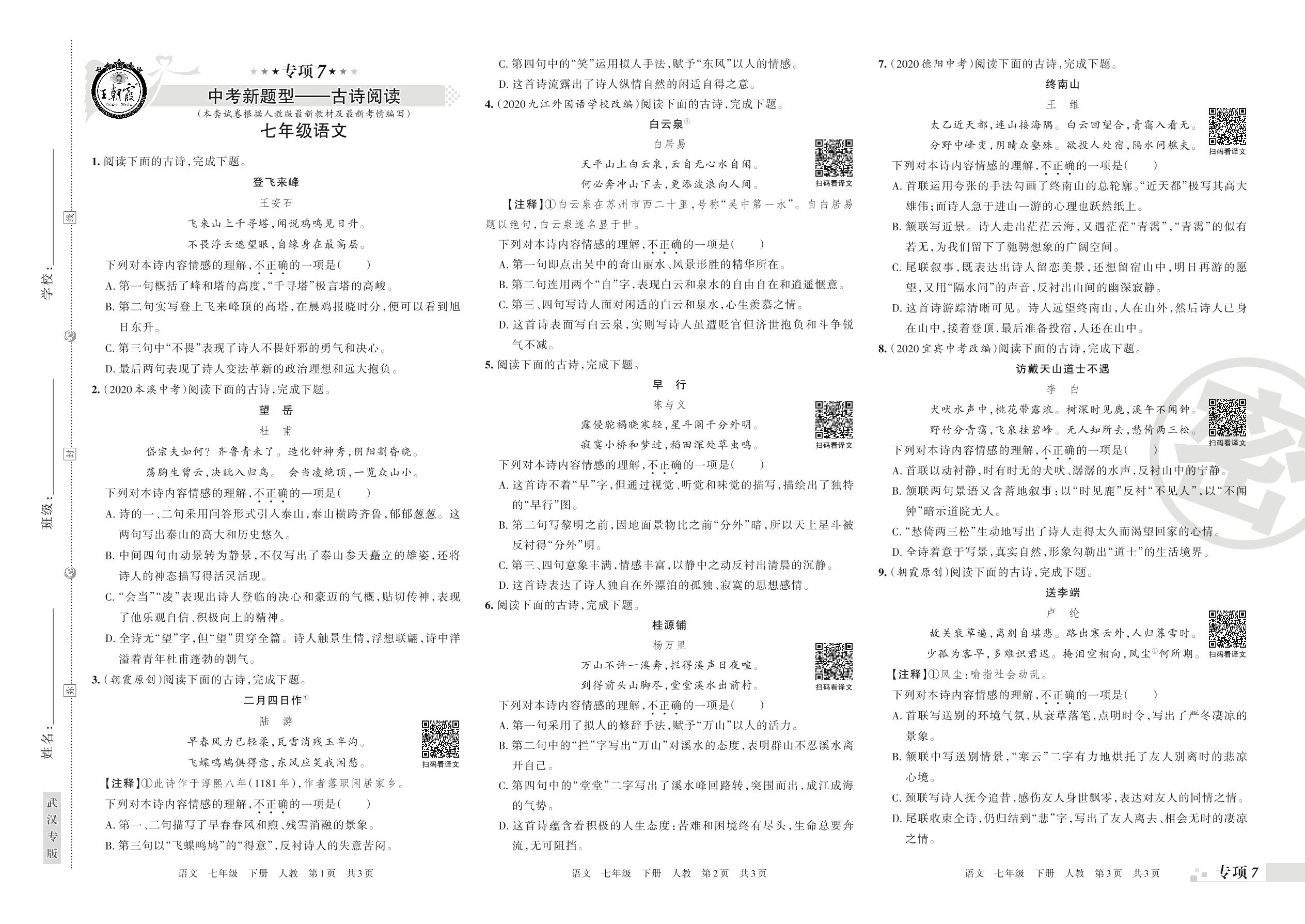 王朝霞期末专项卷——古诗阅读、名著阅读七年级下册语文(人教版)【0】