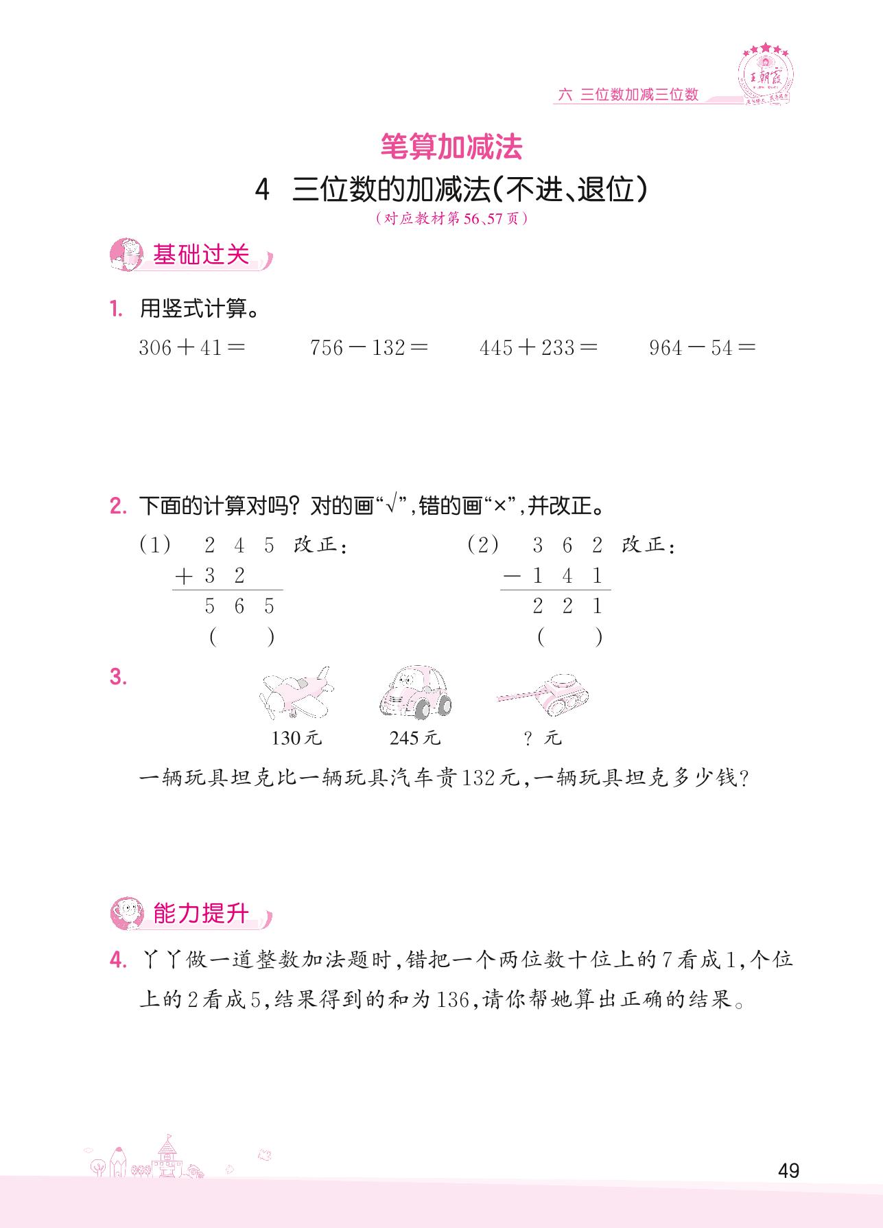 2022下册二年级数学冀教版 六 三位数加减三位数——4 三位数的加减法(不进、退位)