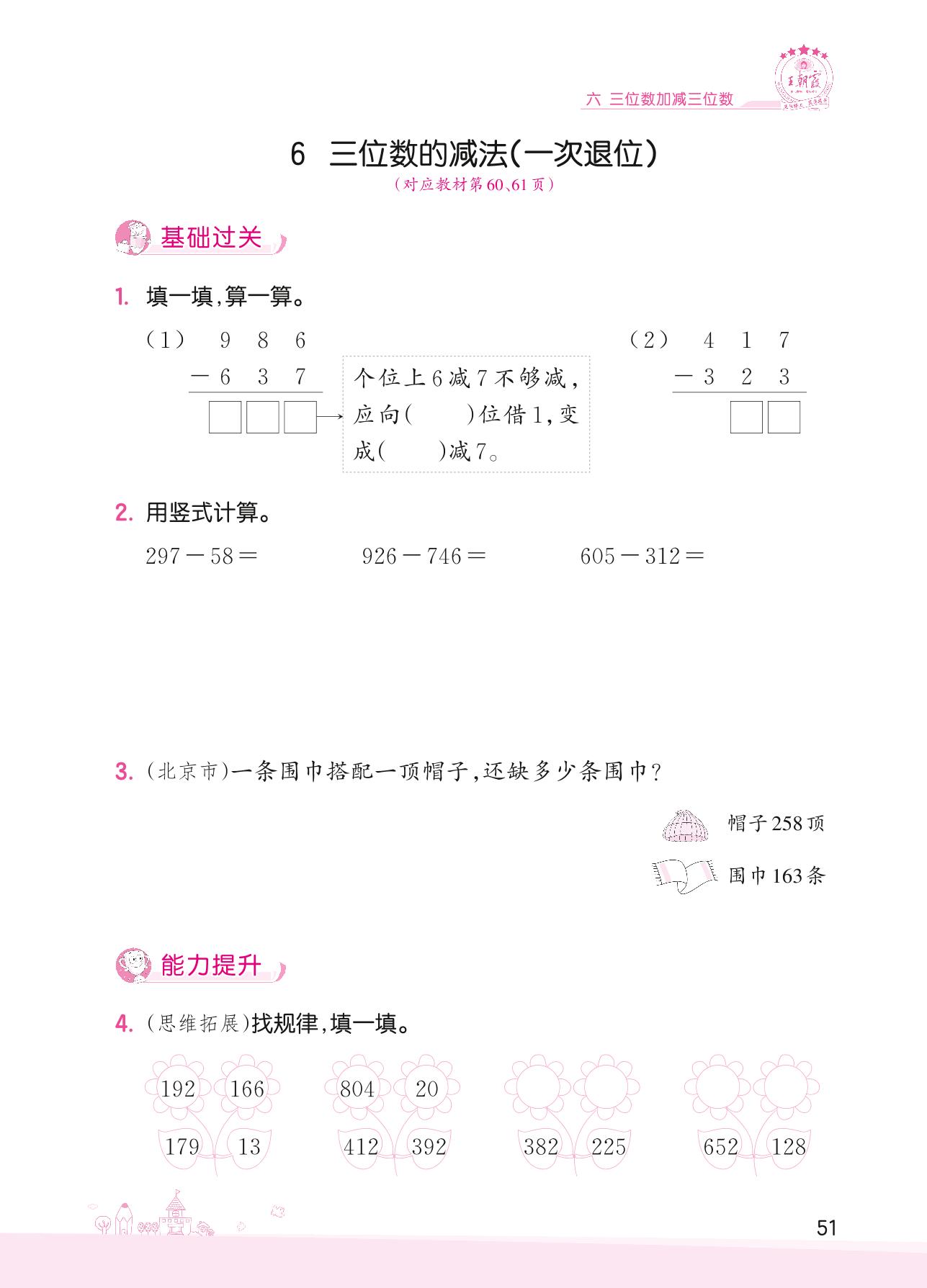 2022下册二年级数学冀教版 六 三位数加减三位数——6 三位数的减法(一次退位)