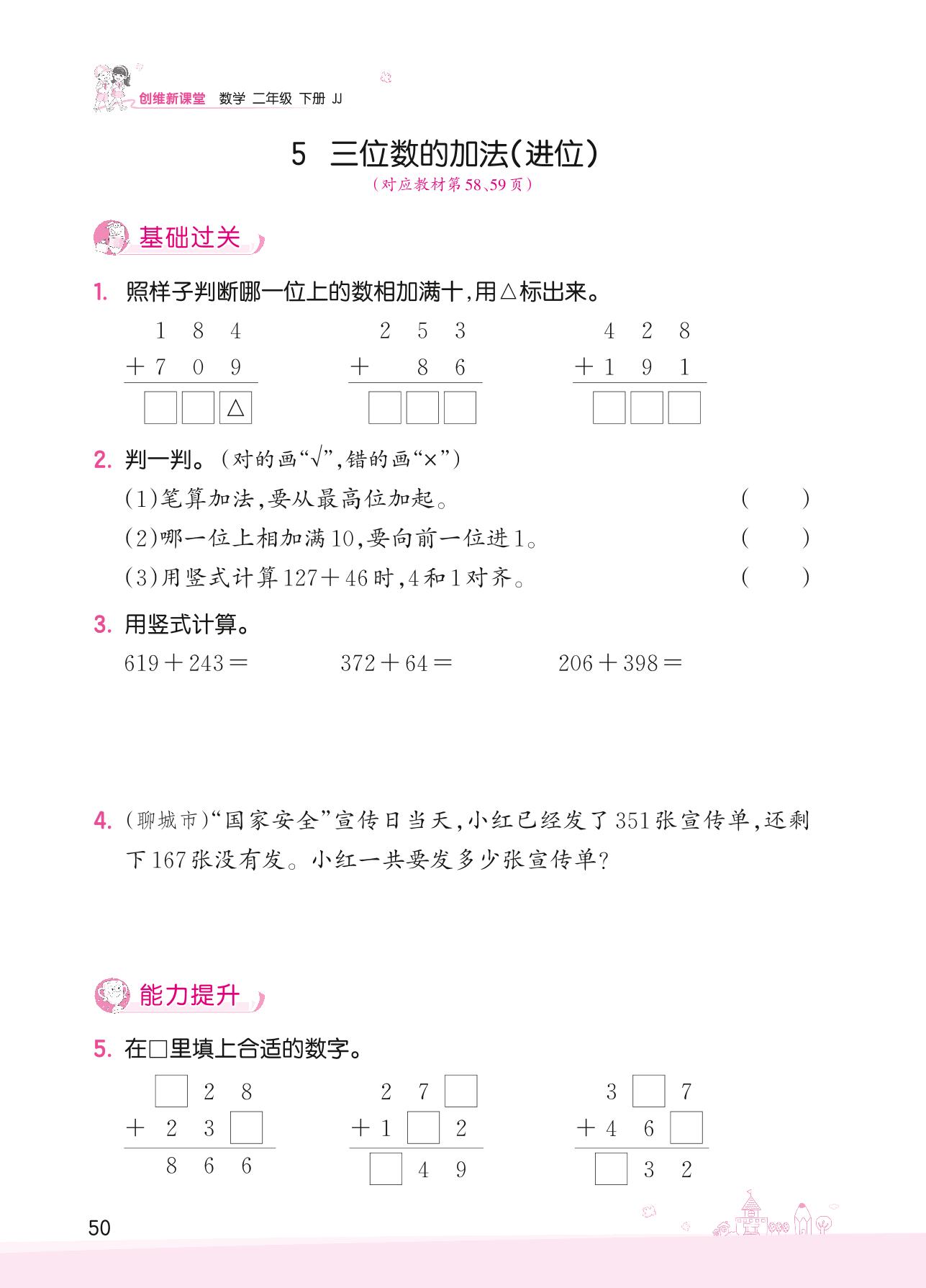 2022下册二年级数学冀教版 六 三位数加减三位数——5 三位数的加法(进位)