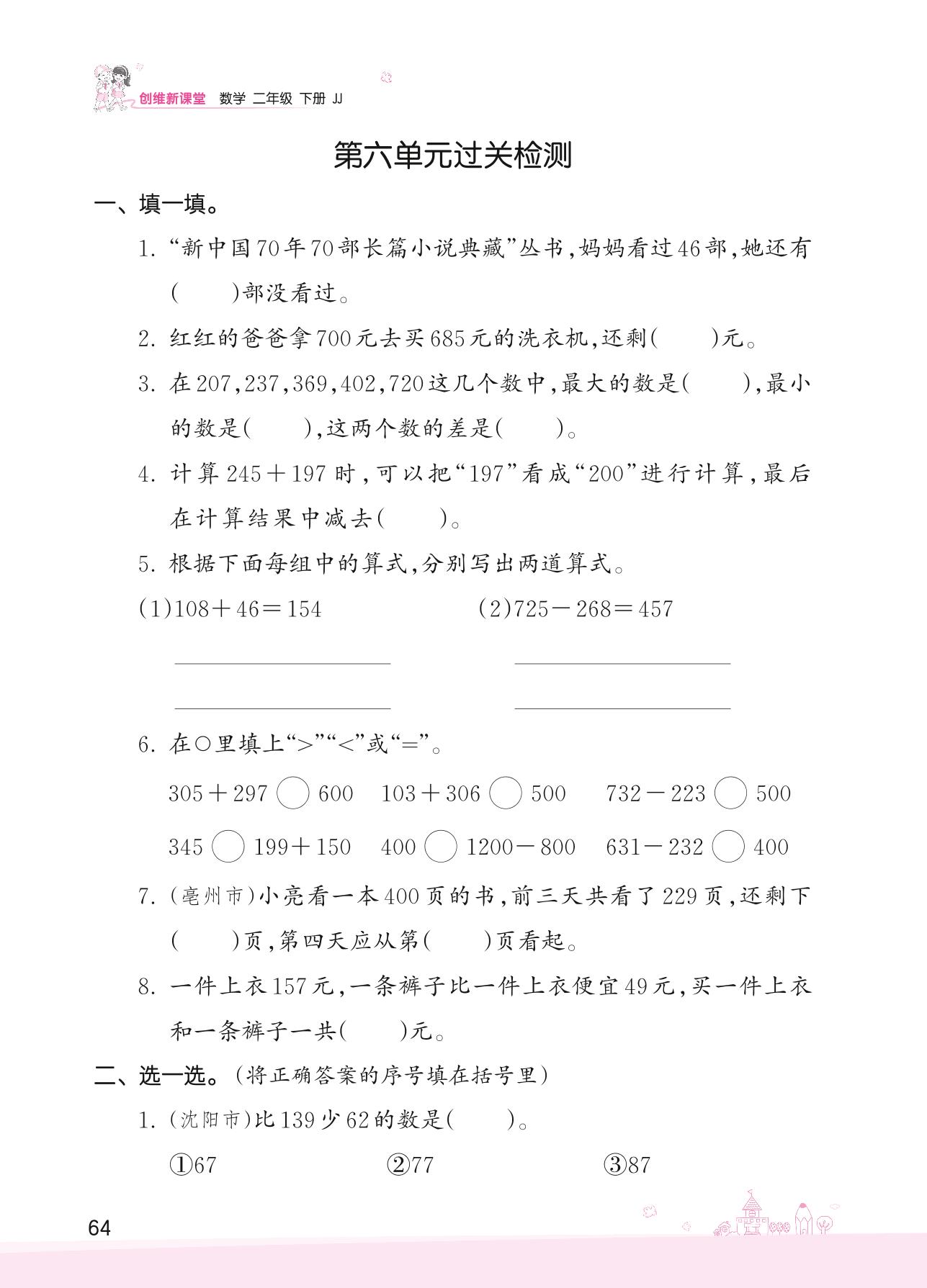 2022下册二年级数学冀教版 六 三位数加减三位数——第六单元过关检测