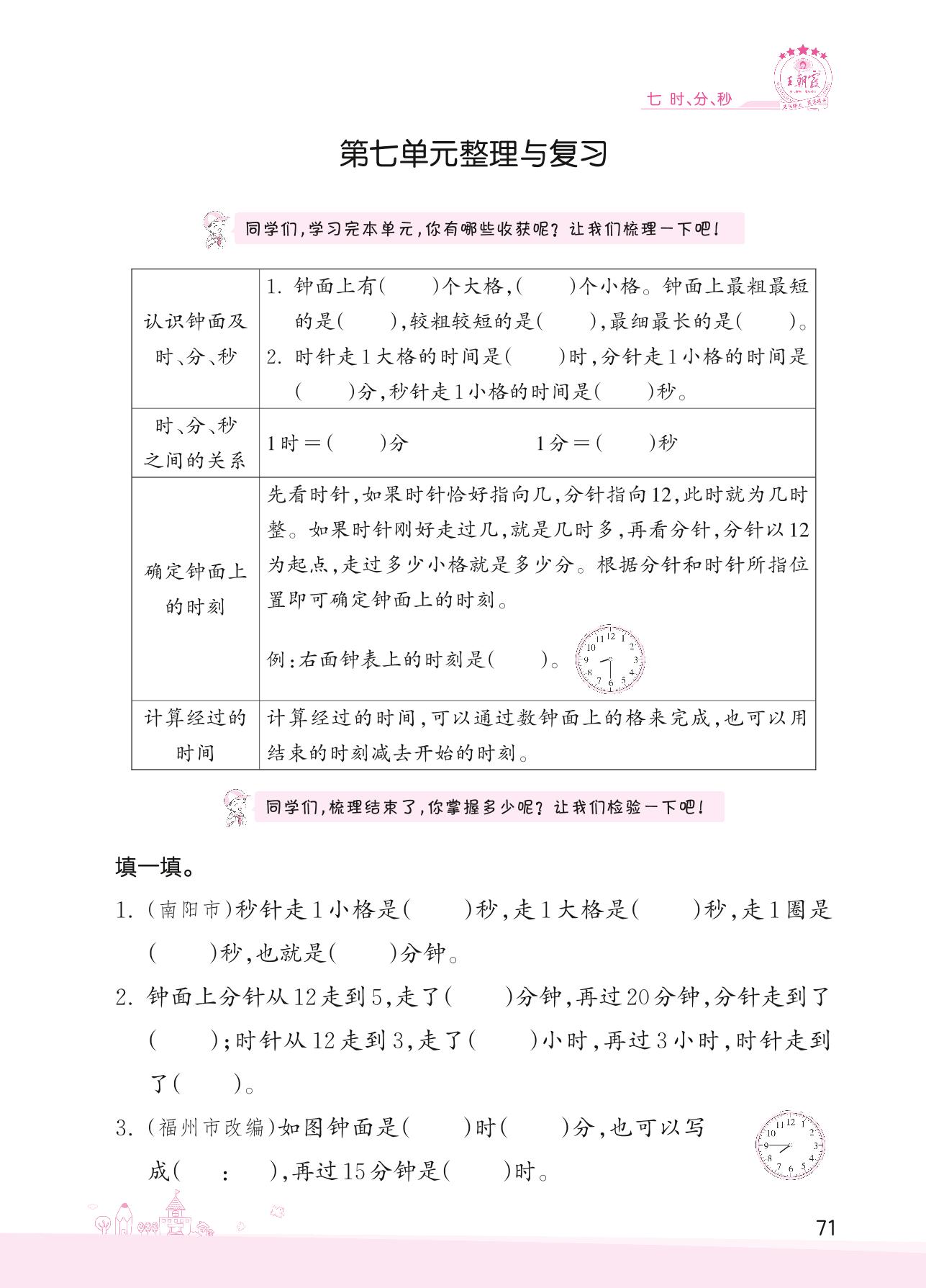 2022下册二年级数学冀教版 七 时、分、秒——第七单元整理与复习