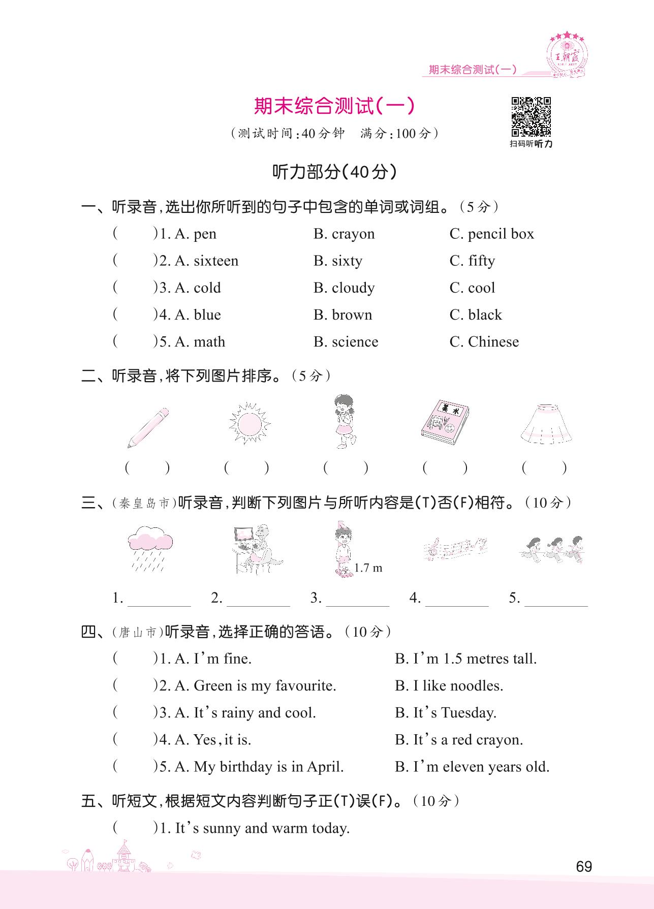 2022下册四年级英语冀教版 期末综合测试(一)