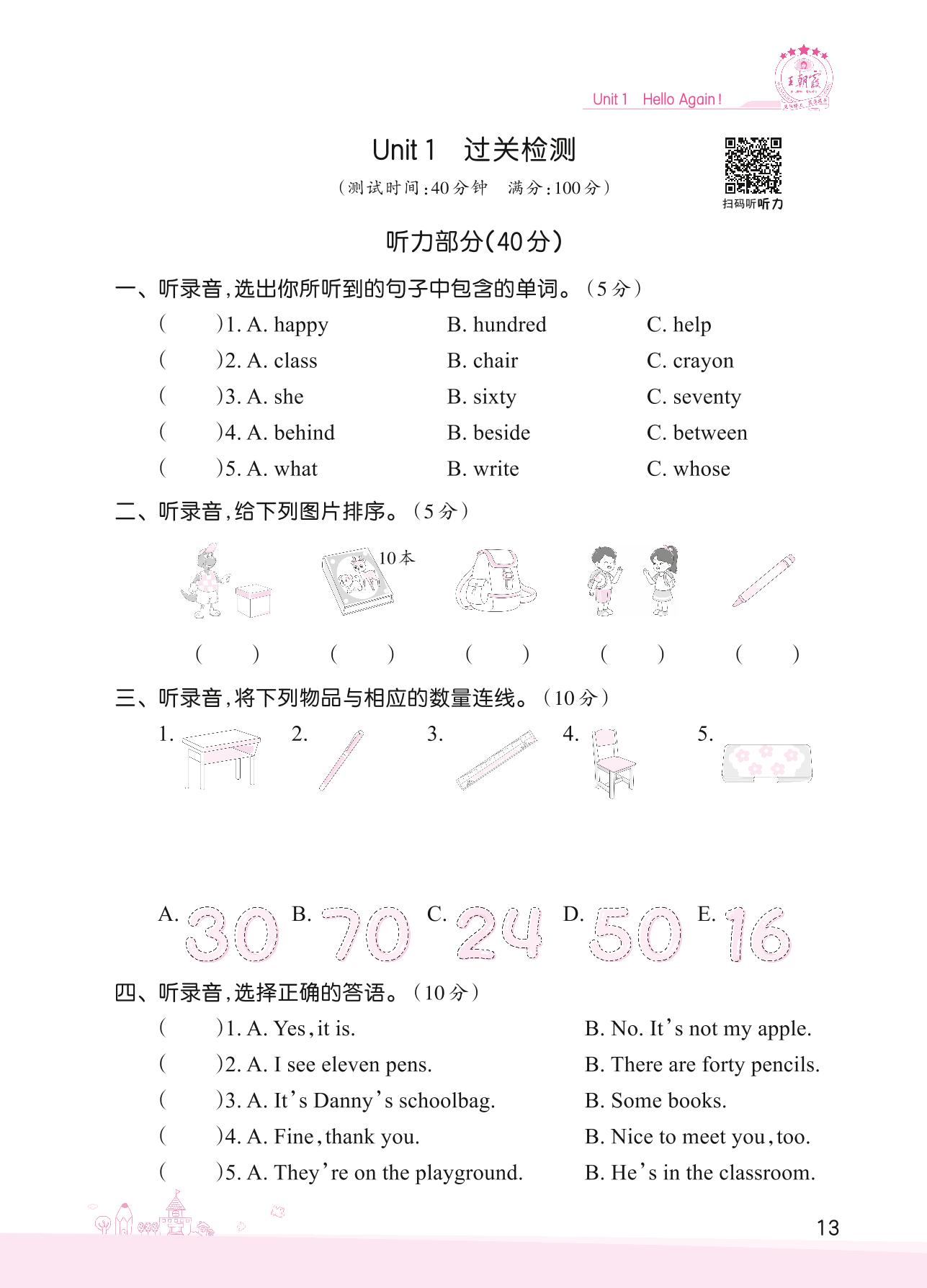 2022下册四年级英语冀教版 Unit 1 过关检测