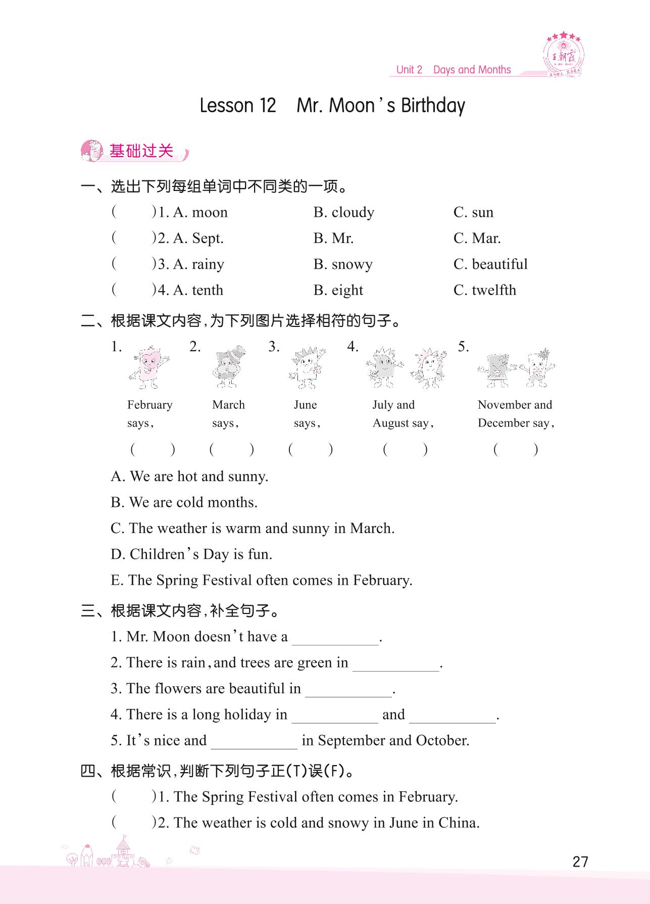 2022下册四年级英语冀教版 Unit 2—Lesson 12 Mr. Moon’s Birthday