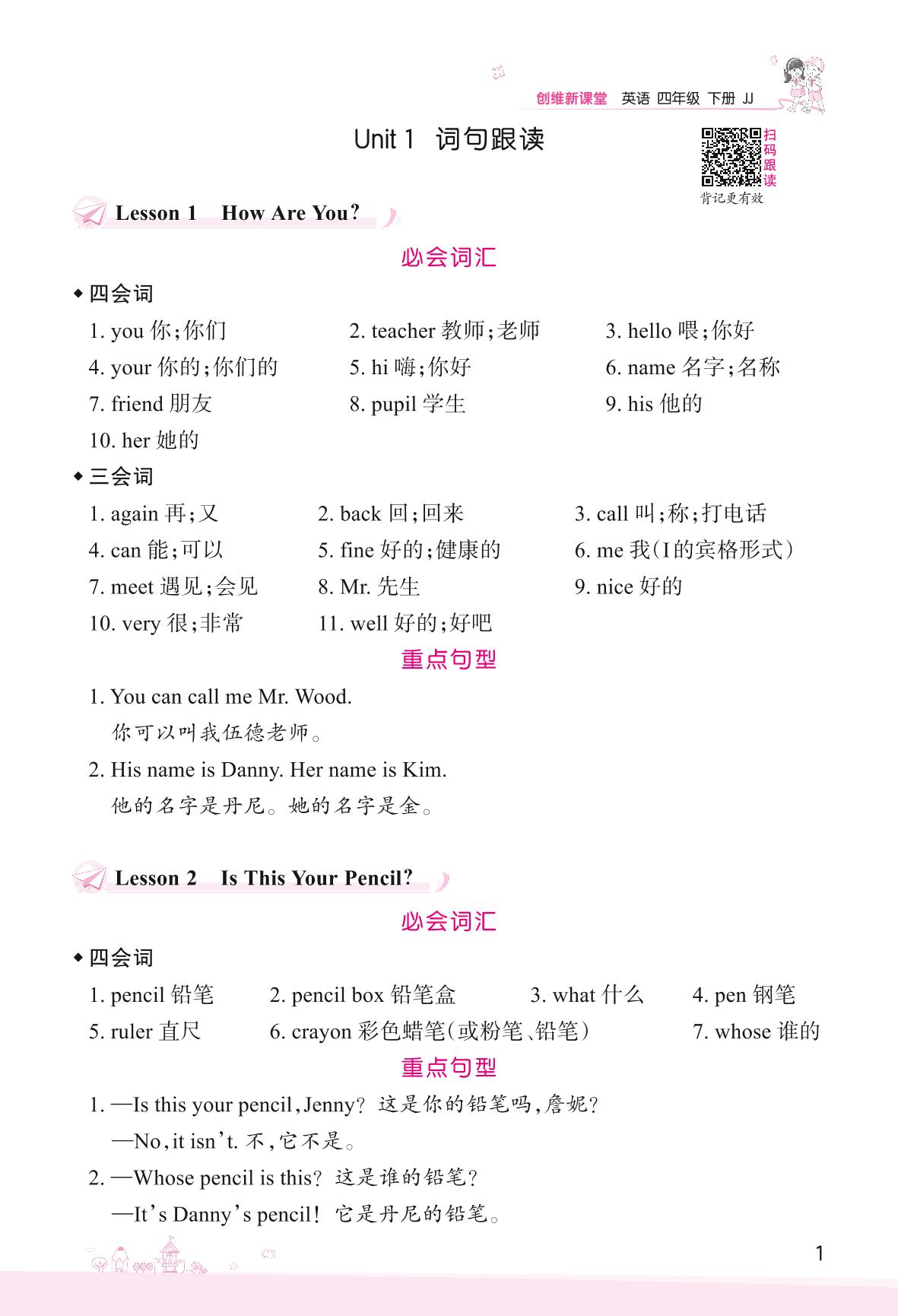 2022下册四年级英语冀教版 Unit 1 Hello Again!—词句跟读