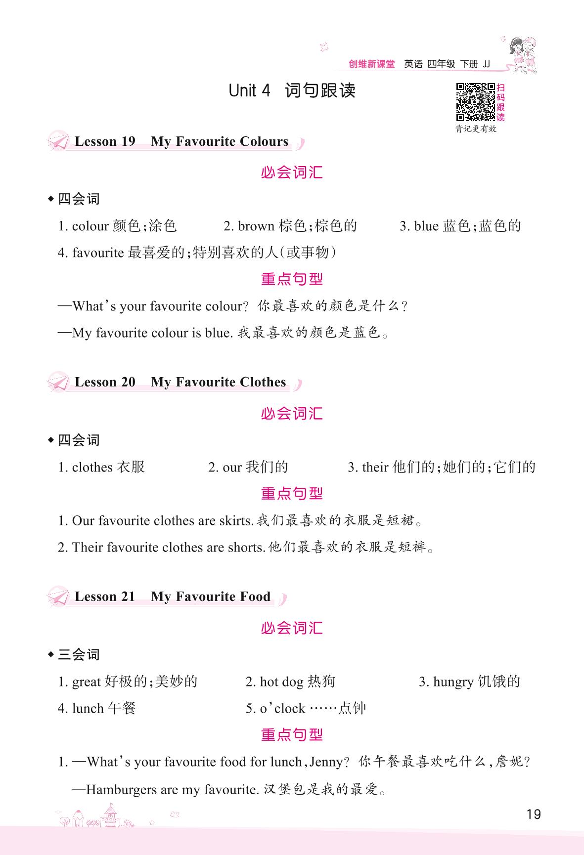 2022下册四年级英语冀教版 Unit 4 My Favourites—词句跟读