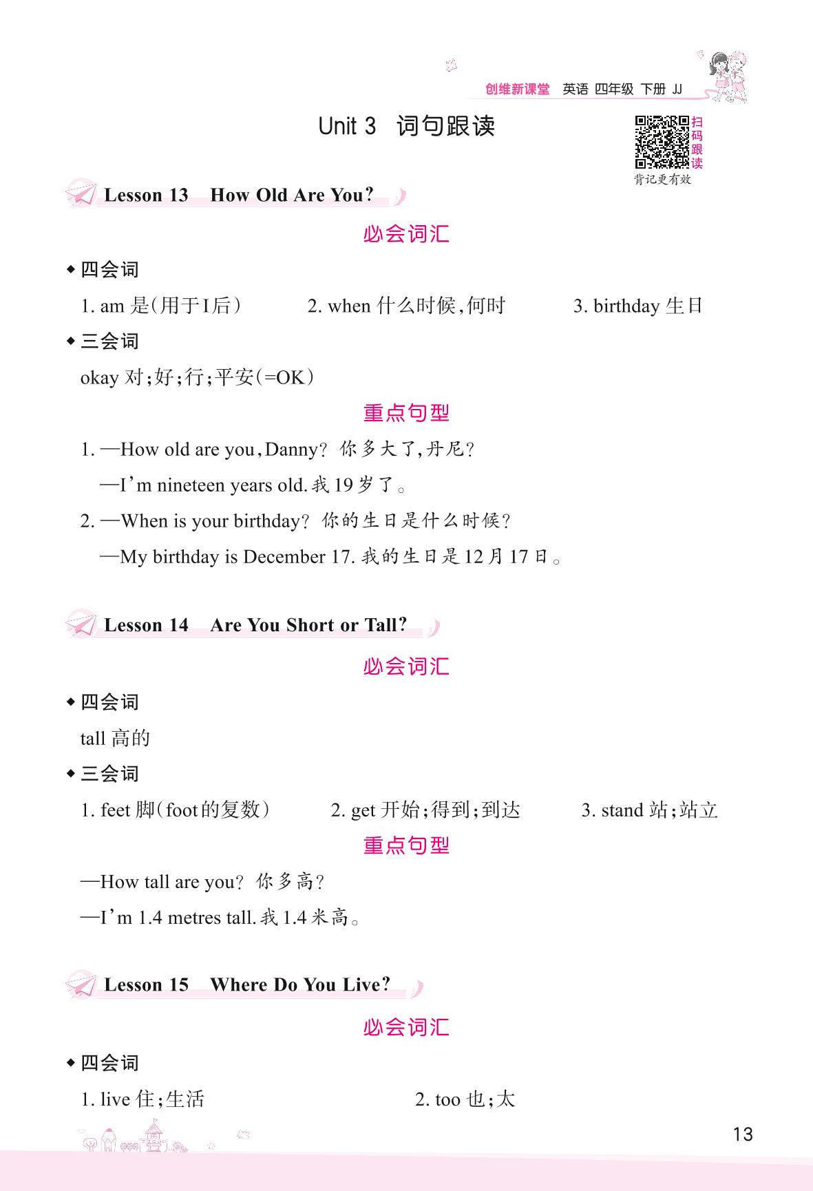 2022下册四年级英语冀教版 Unit 3 All about Me—词句跟读