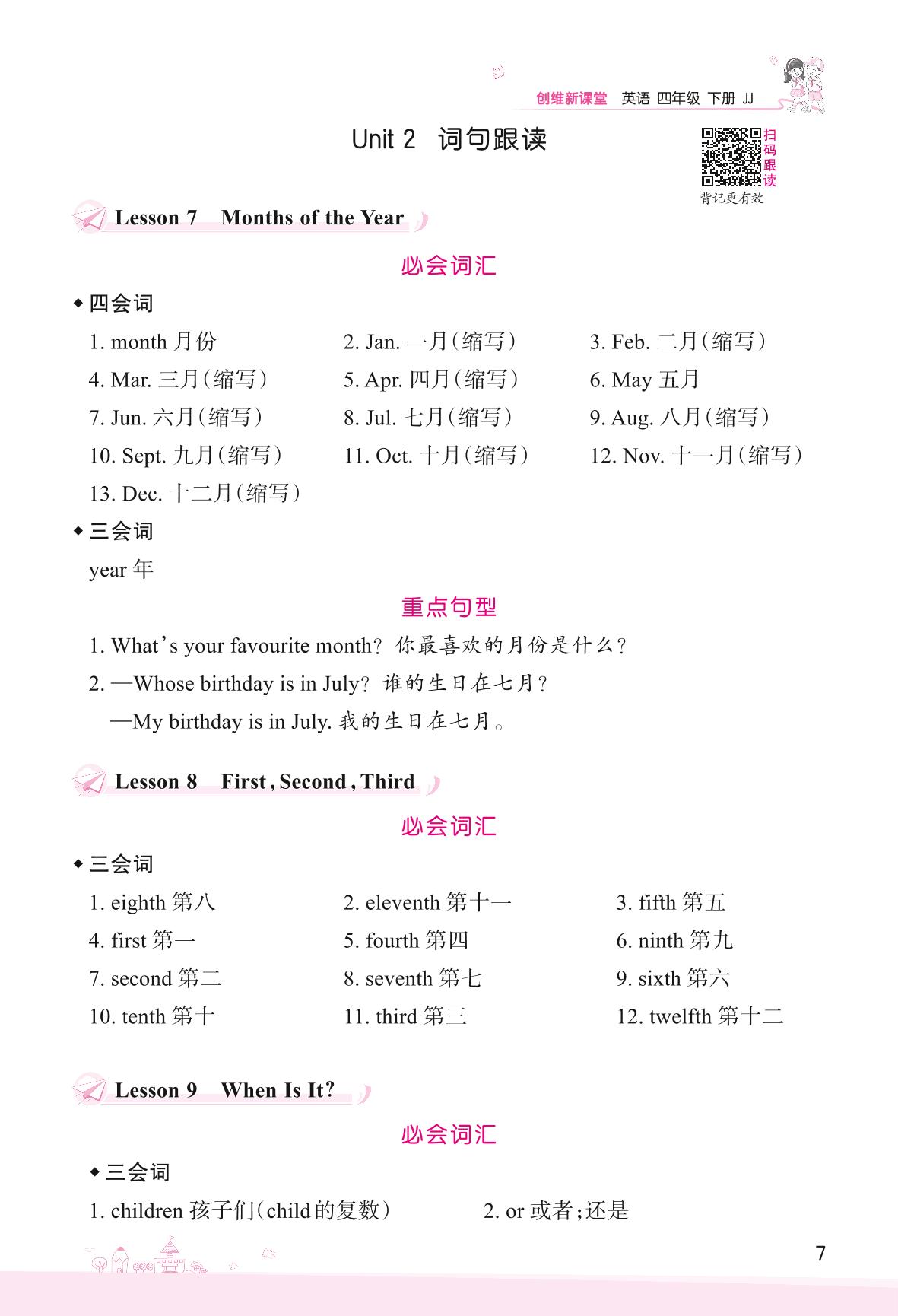 2022下册四年级英语冀教版 Unit 2 Days and Months—词句跟读