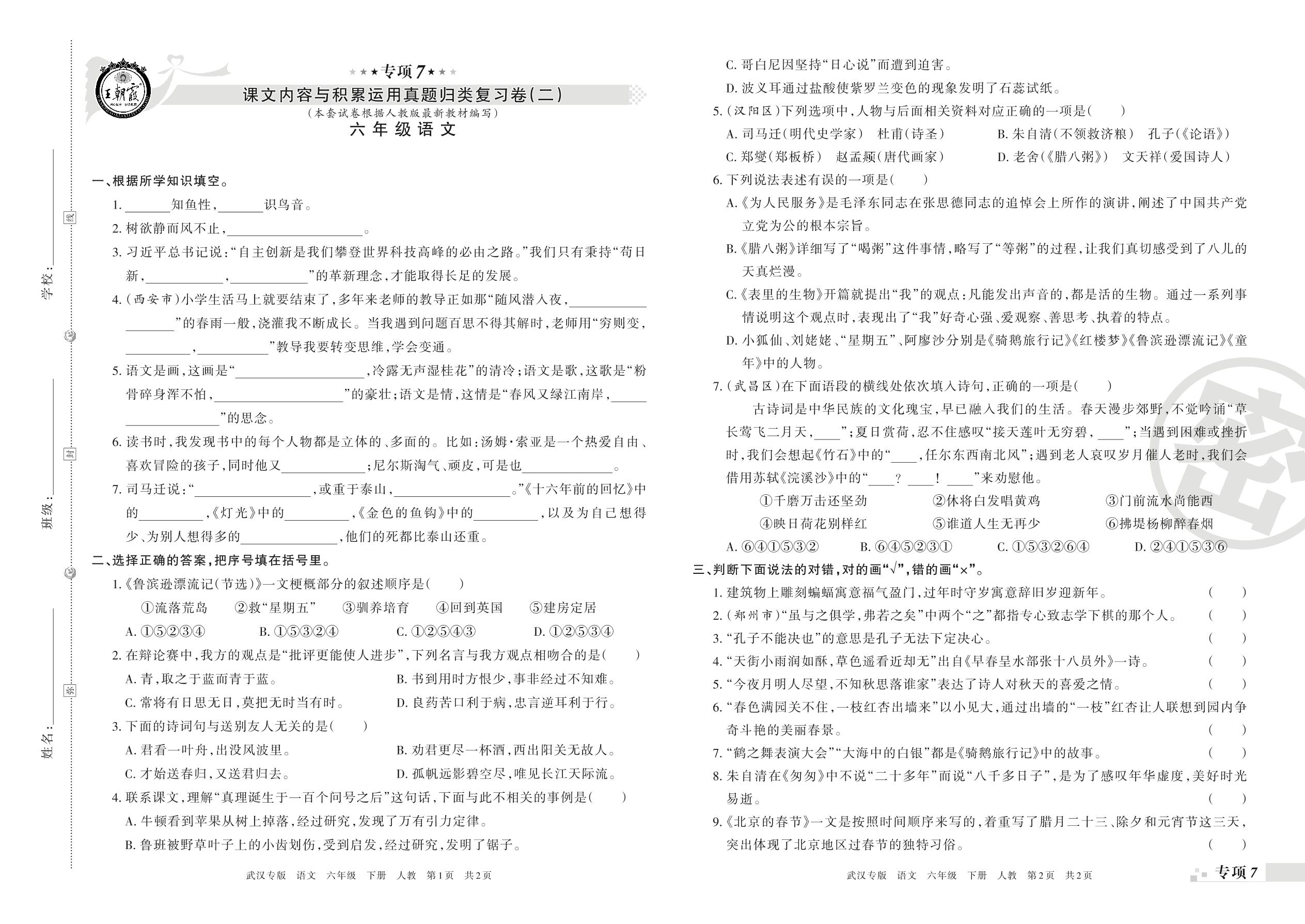 王朝霞期末专项卷——课文内容与积累运用、课内阅读真题归类复习六年级下册语文(人教版)【0】