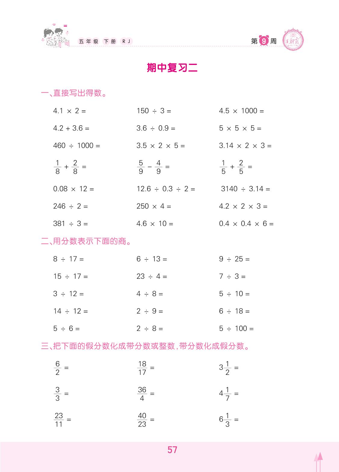 2022下册五年级数学人教版 期中复习二(计算专练)