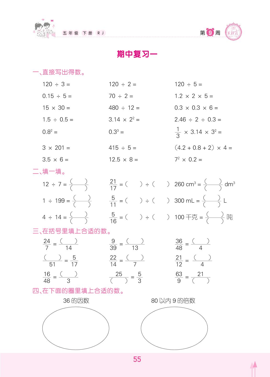 2022下册五年级数学人教版 期中复习一(计算专练)