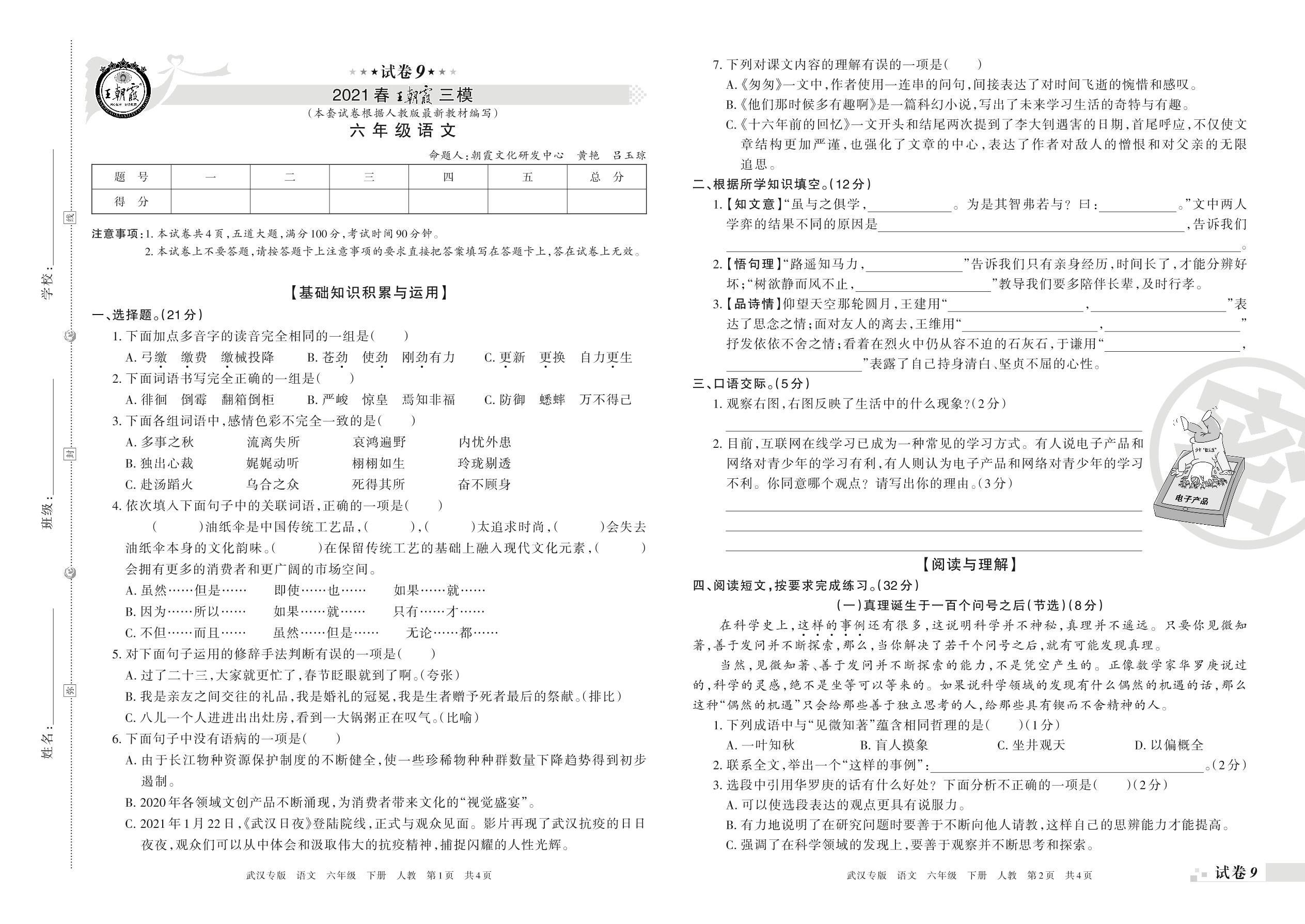王朝霞期末模拟卷六年级下册语文(人教版)_R2108024056【9】