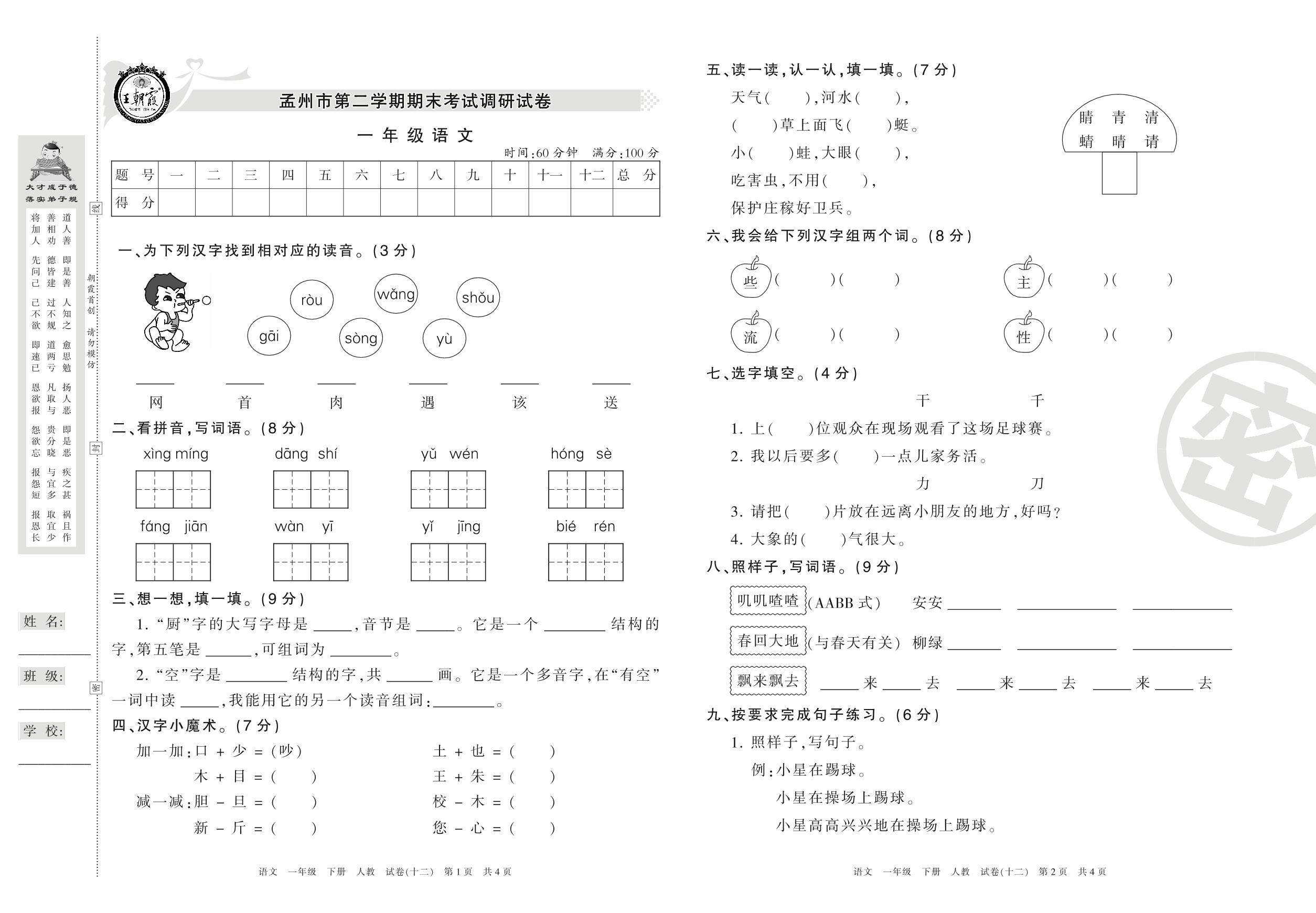 一年级语文人教版下册期末卷