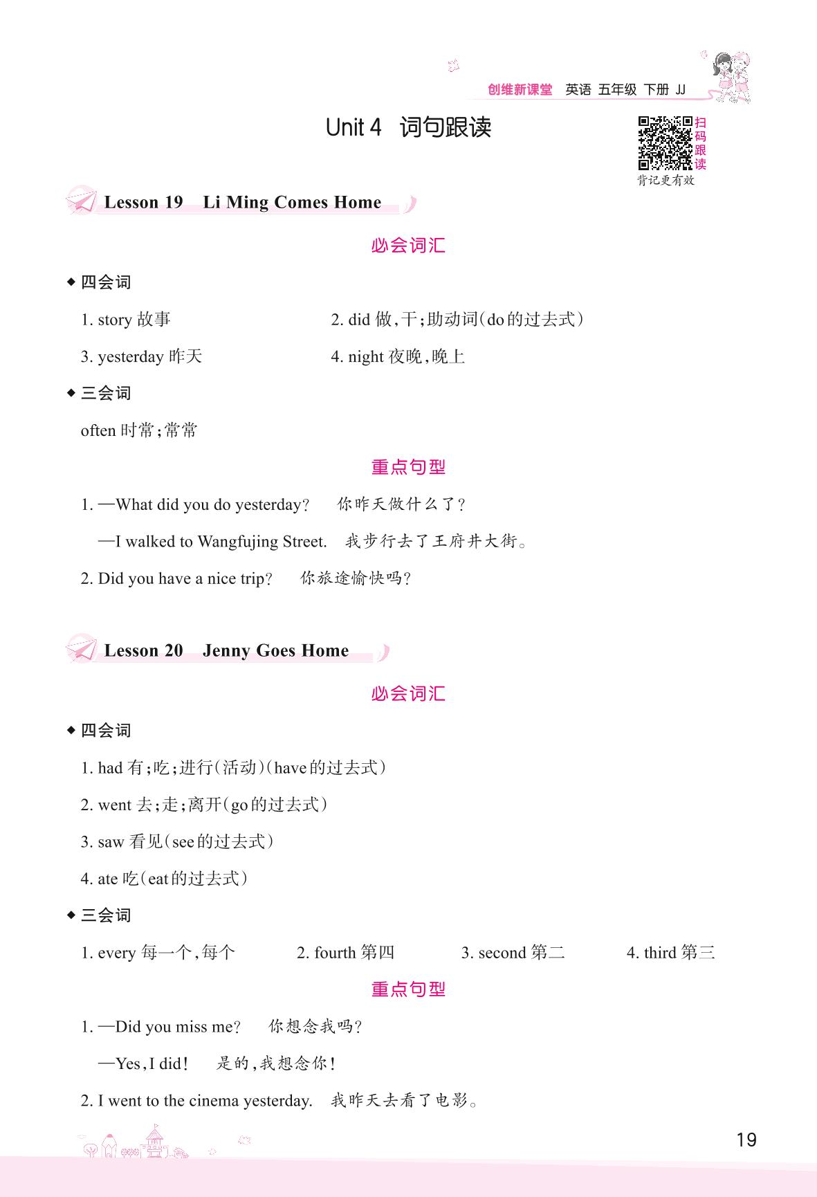 2022下册五年级英语冀教版 Unit 4 Did You Have a Nice Trip?—词句跟读