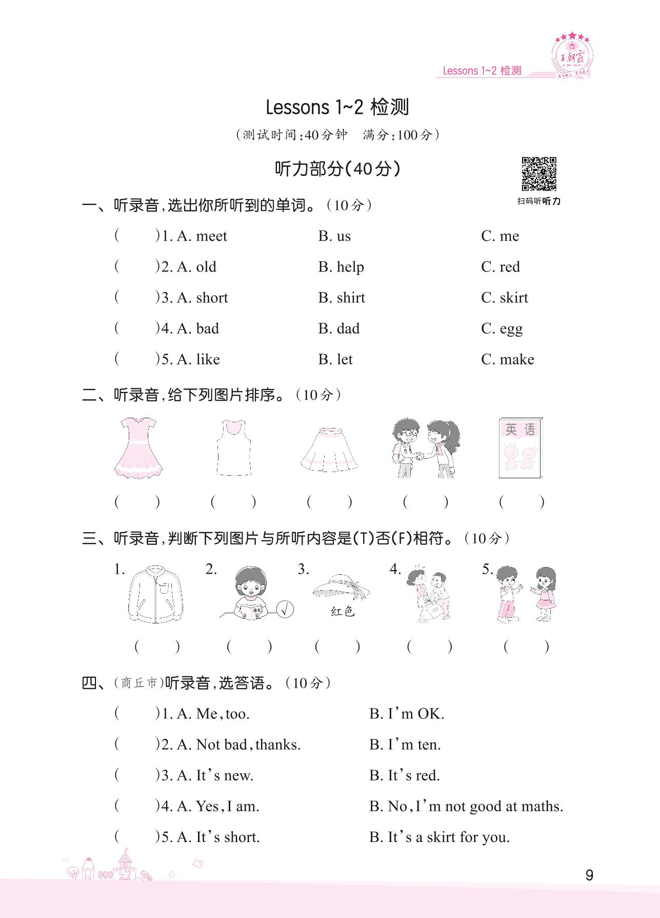 2022下册三年级英语科普版 Lessons 1~2 检测