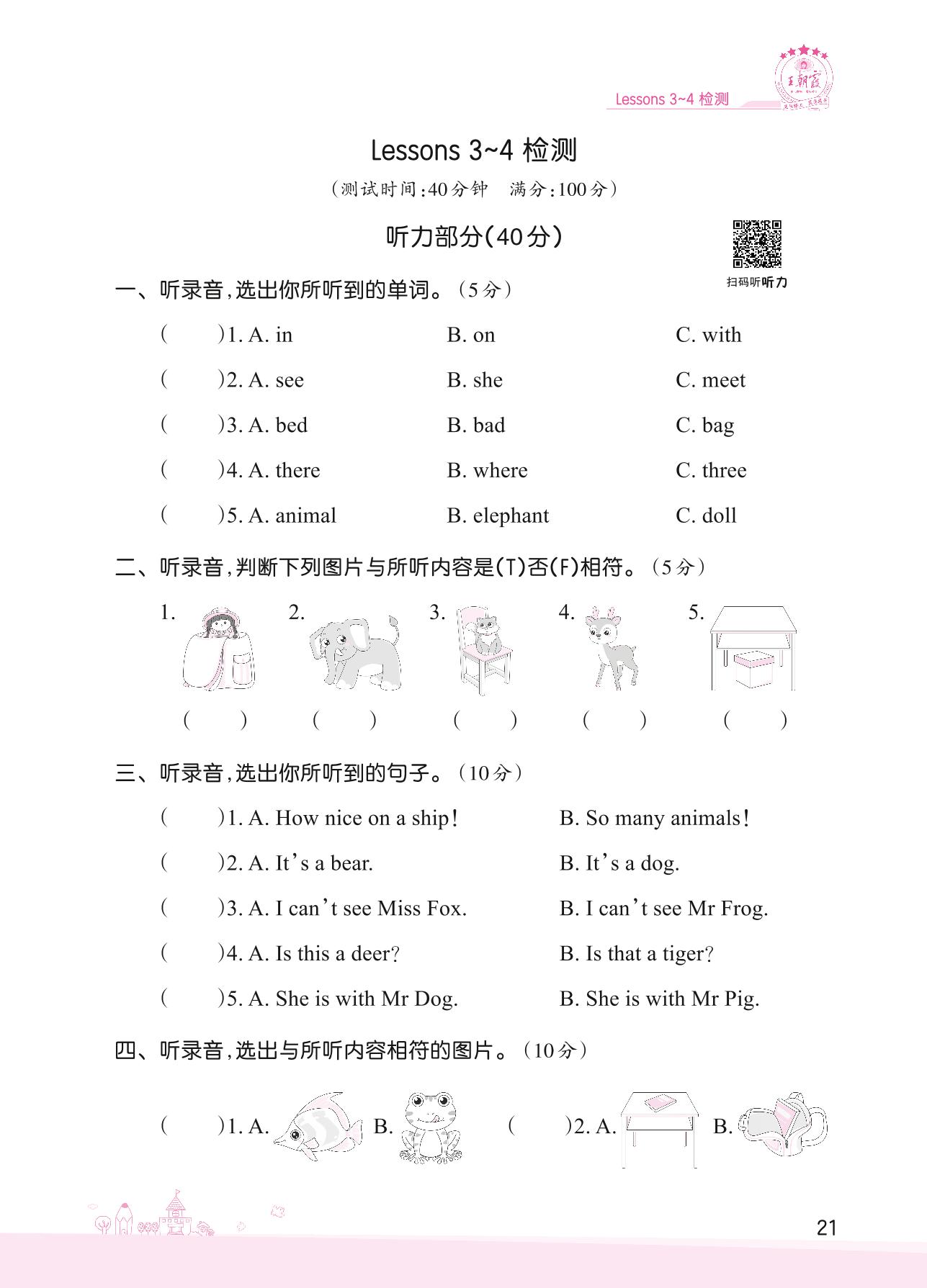 2022下册三年级英语科普版 Lessons 3~4 检测