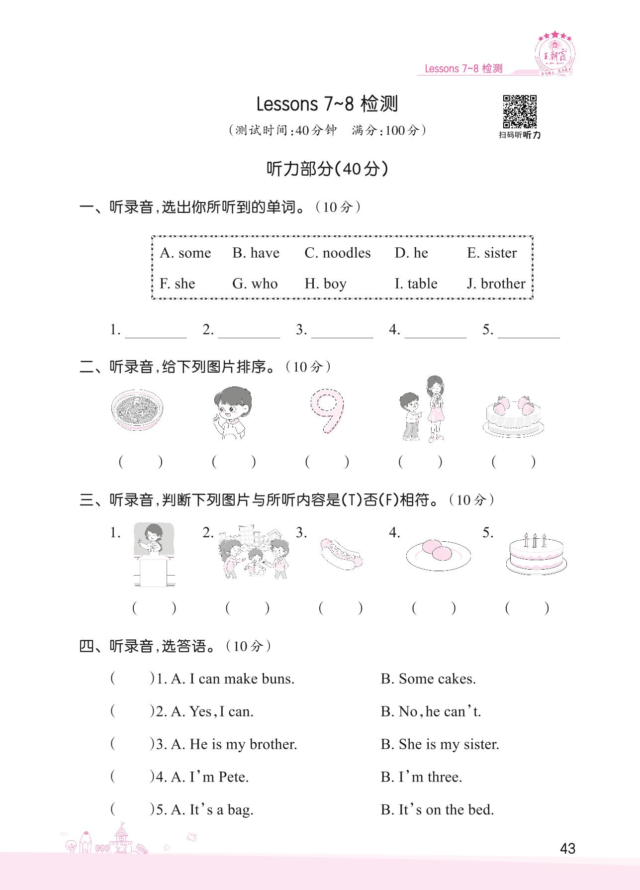 2022下册三年级英语科普版 Lessons 7~8 检测