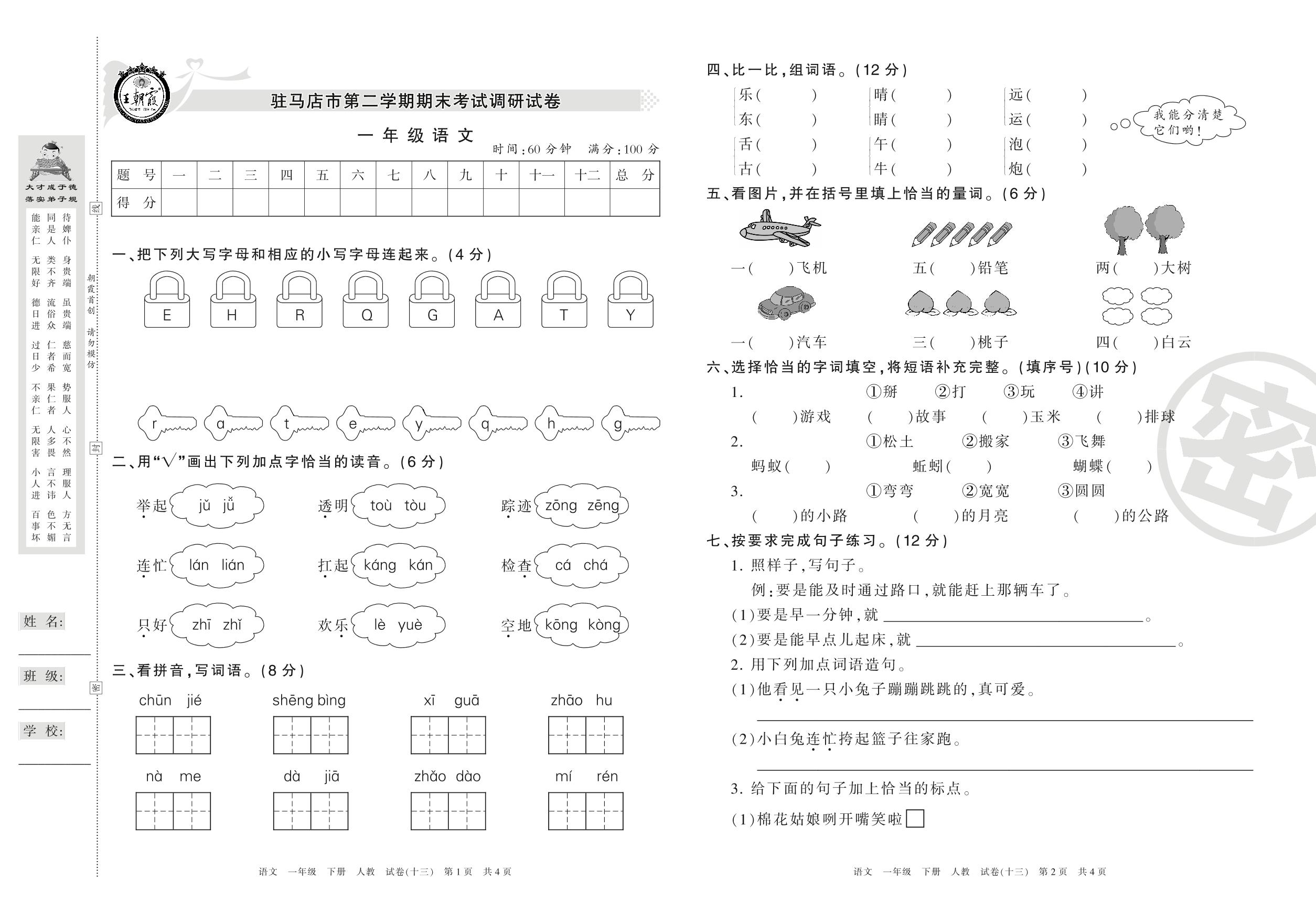 2015-2016学年第二学期驻马店市一年级语文试卷(人教版)【13】
