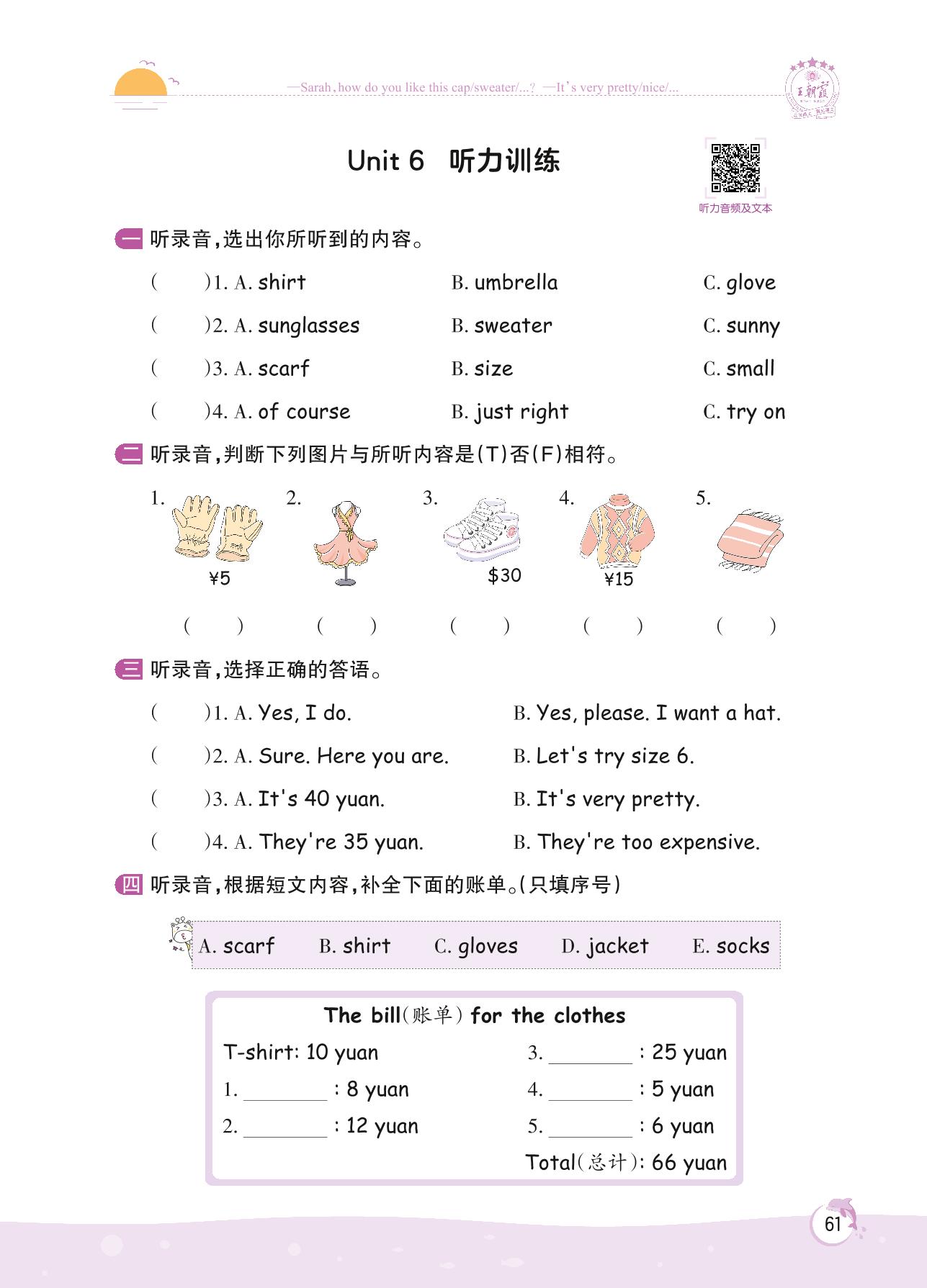 2022下册四年级英语人教PEP版 Unit 6 听力训练