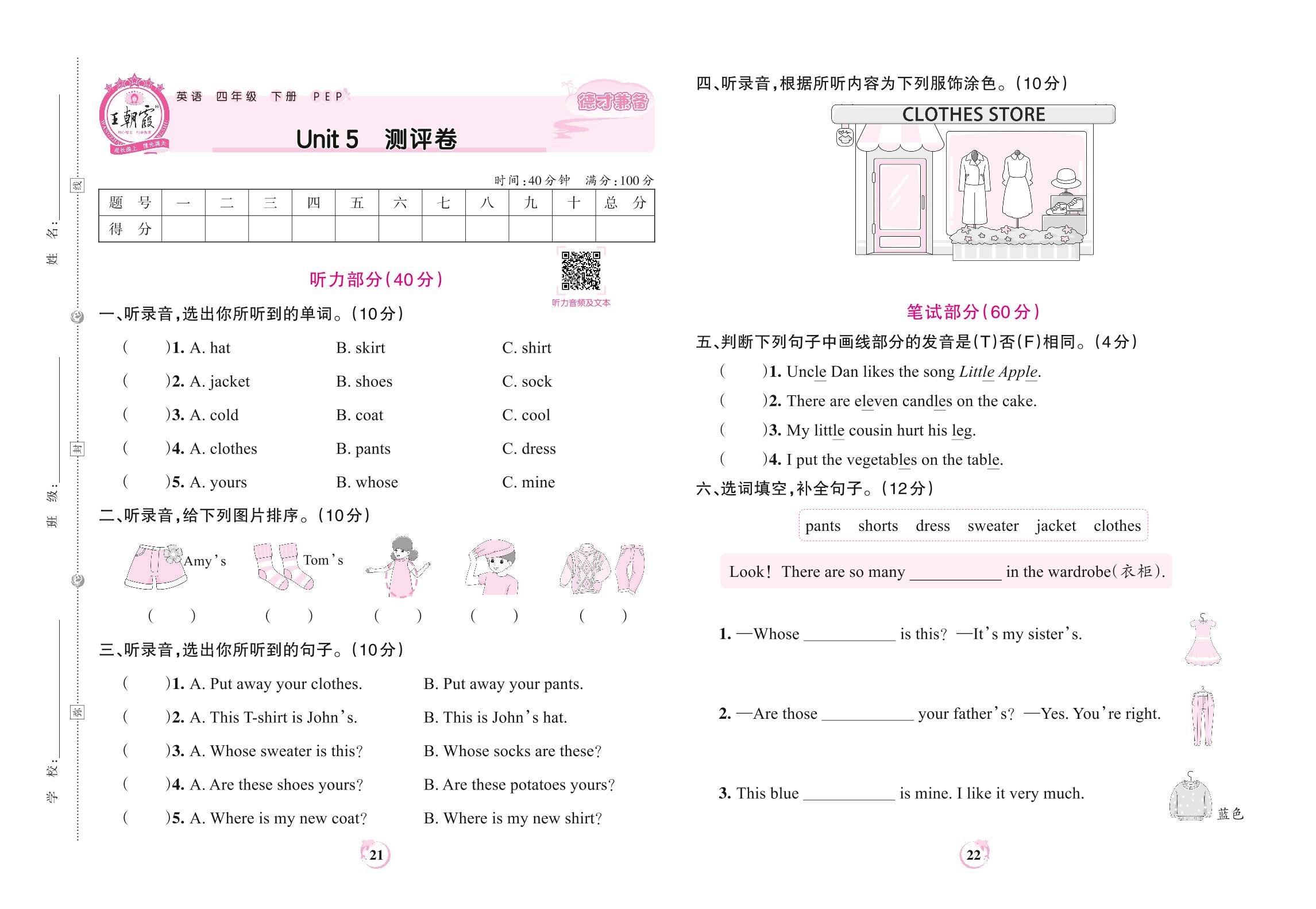 2022下册四年级英语人教PEP版 Unit 5 测评卷