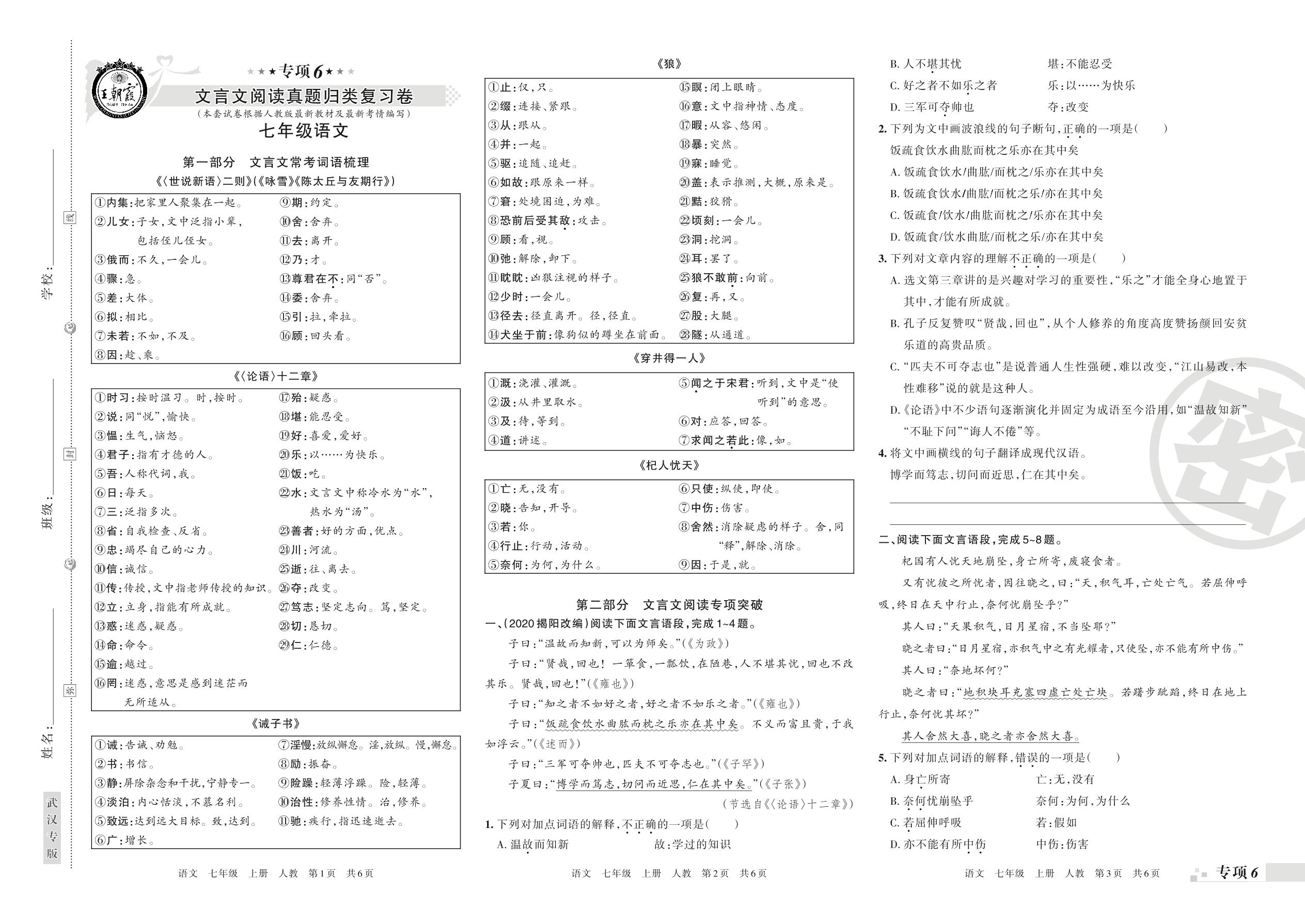 王朝霞期末专项卷——文言文阅读真题归类复习七年级上册语文(人教版)