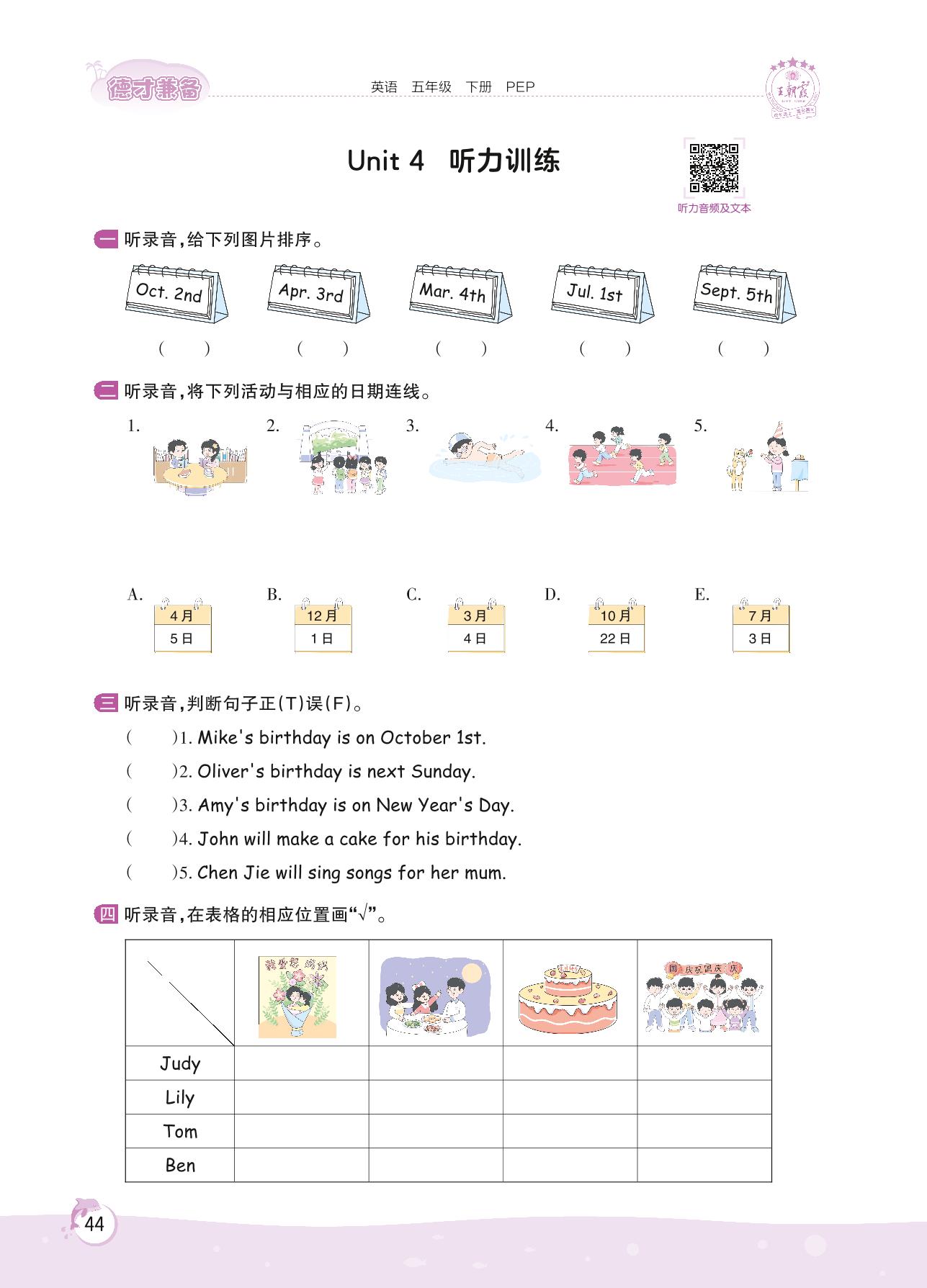2022下册五年级英语人教PEP版 Unit 4 听力训练
