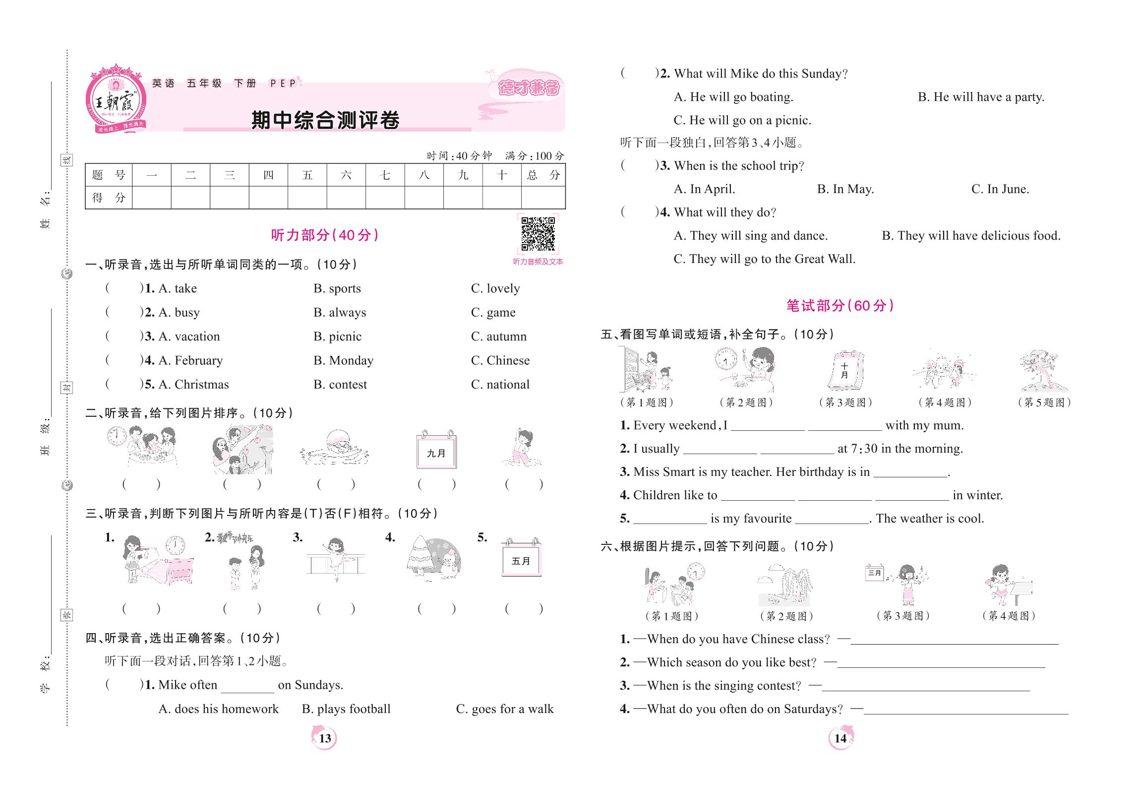 五年级英语人教PEP版(三起始)下册期中卷