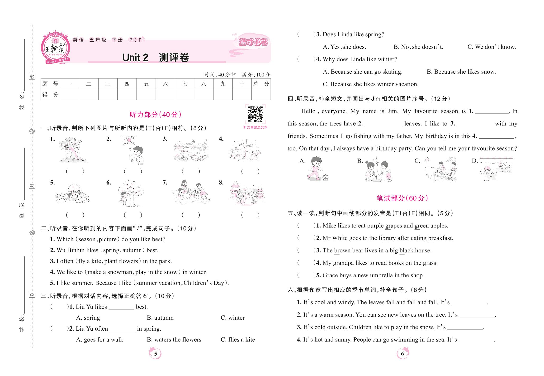 2022下册五年级英语人教PEP版 Unit 2 测评卷