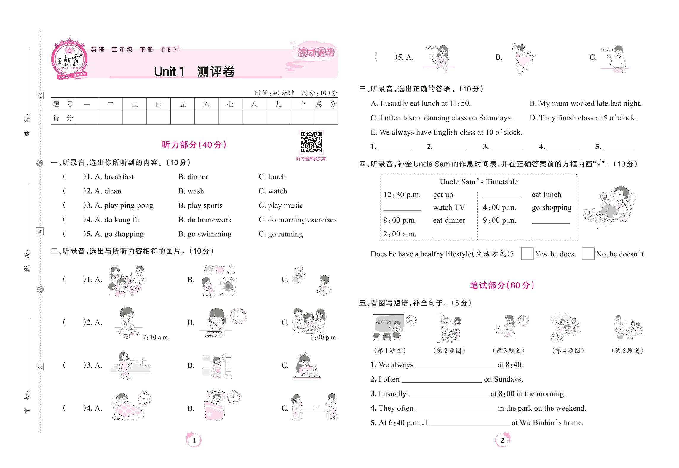 五年级英语人教PEP版(三起始)下册单元卷