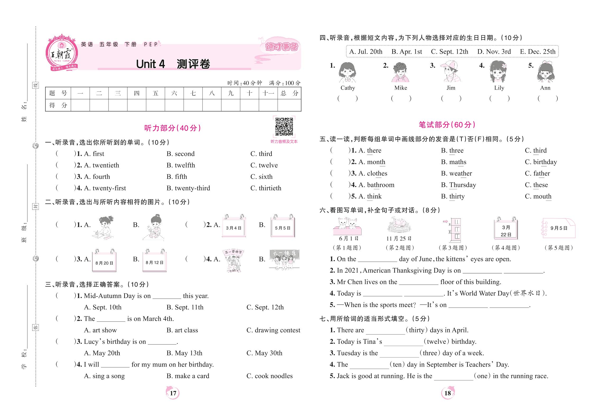 2022下册五年级英语人教PEP版 Unit 4 测评卷