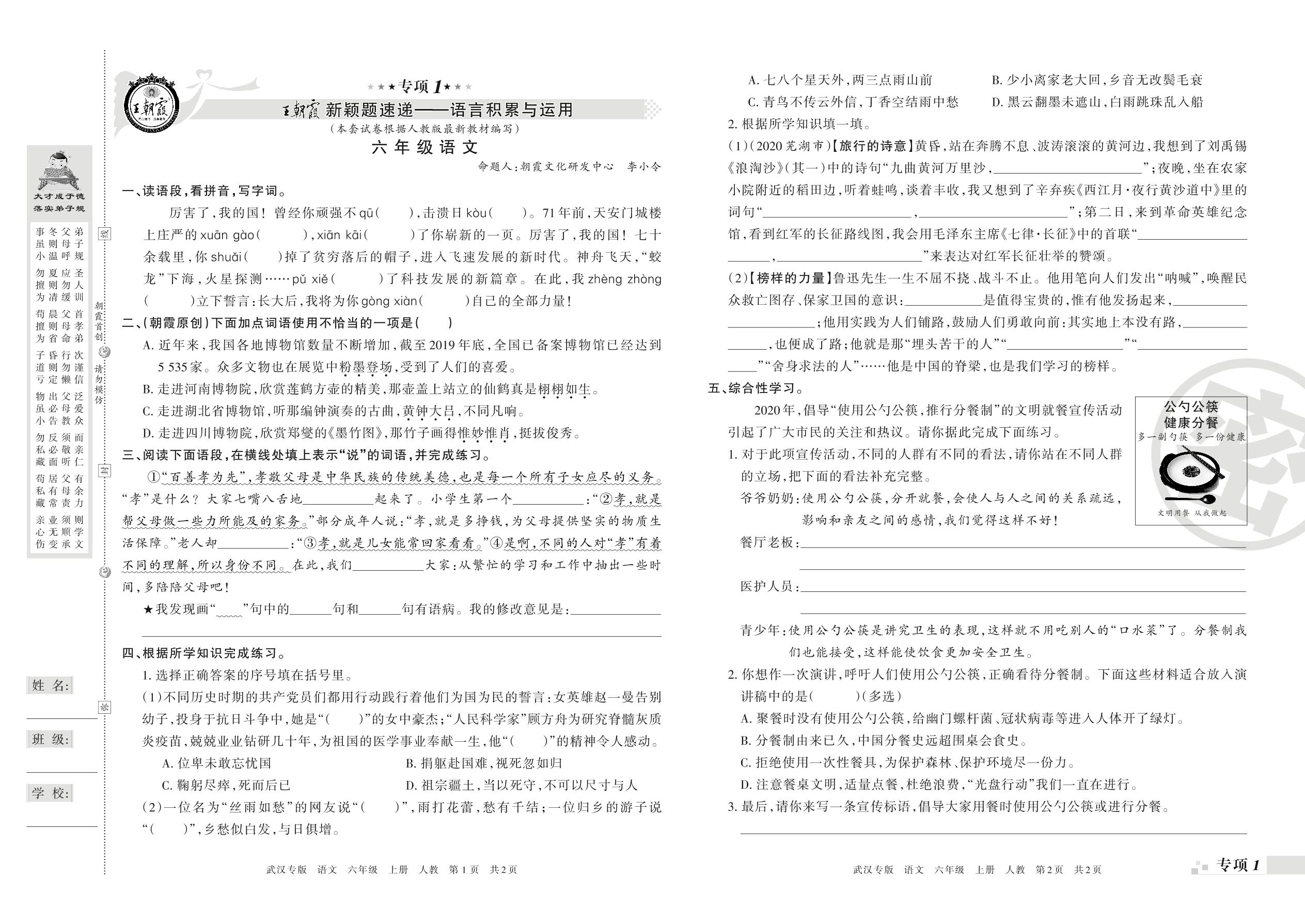 王朝霞期末专项卷——语言积累与运用、非连续性文本阅读六年级上册语文(人教版)【0】