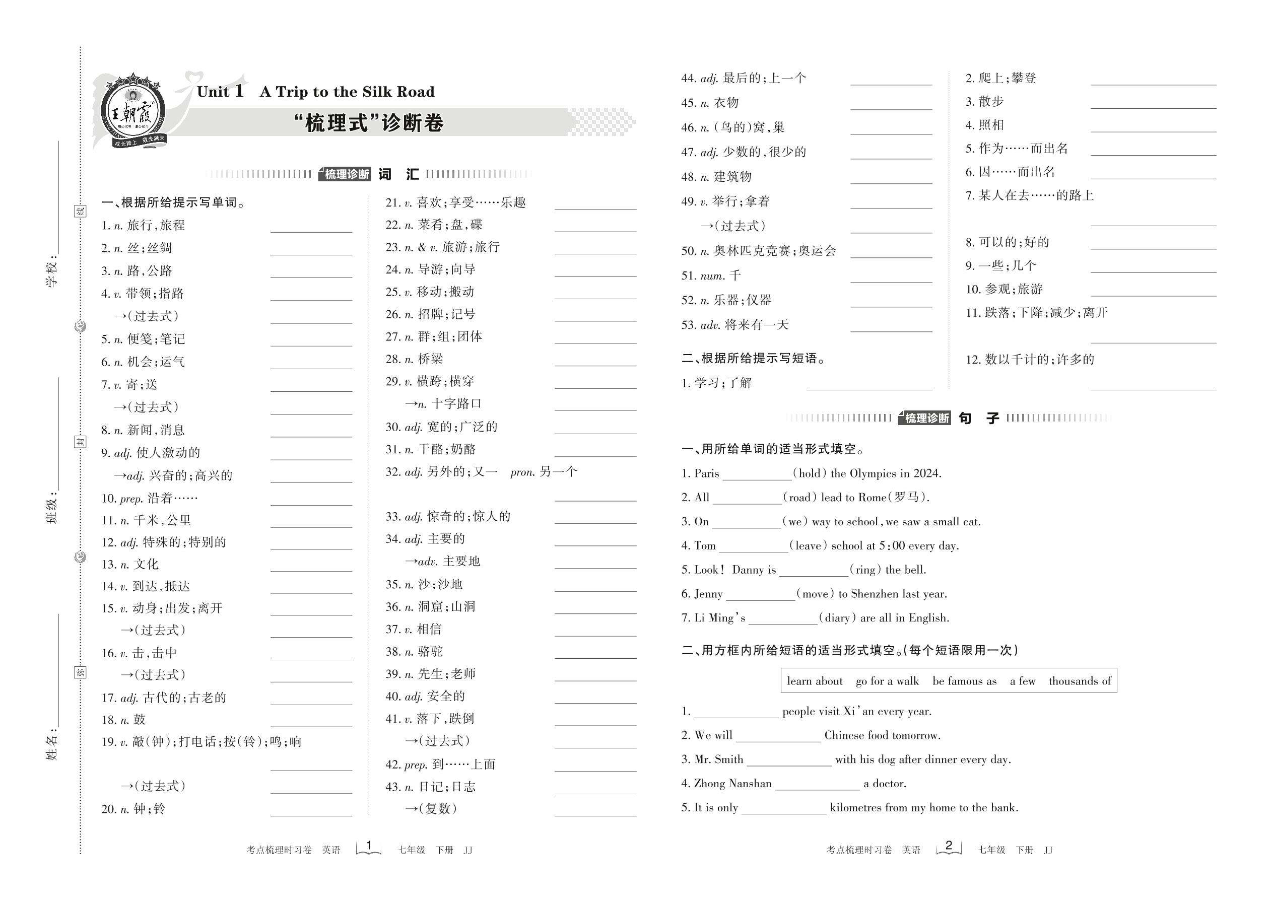 2022下册七年级英语冀教版 Unit 1 “梳理式”诊断卷