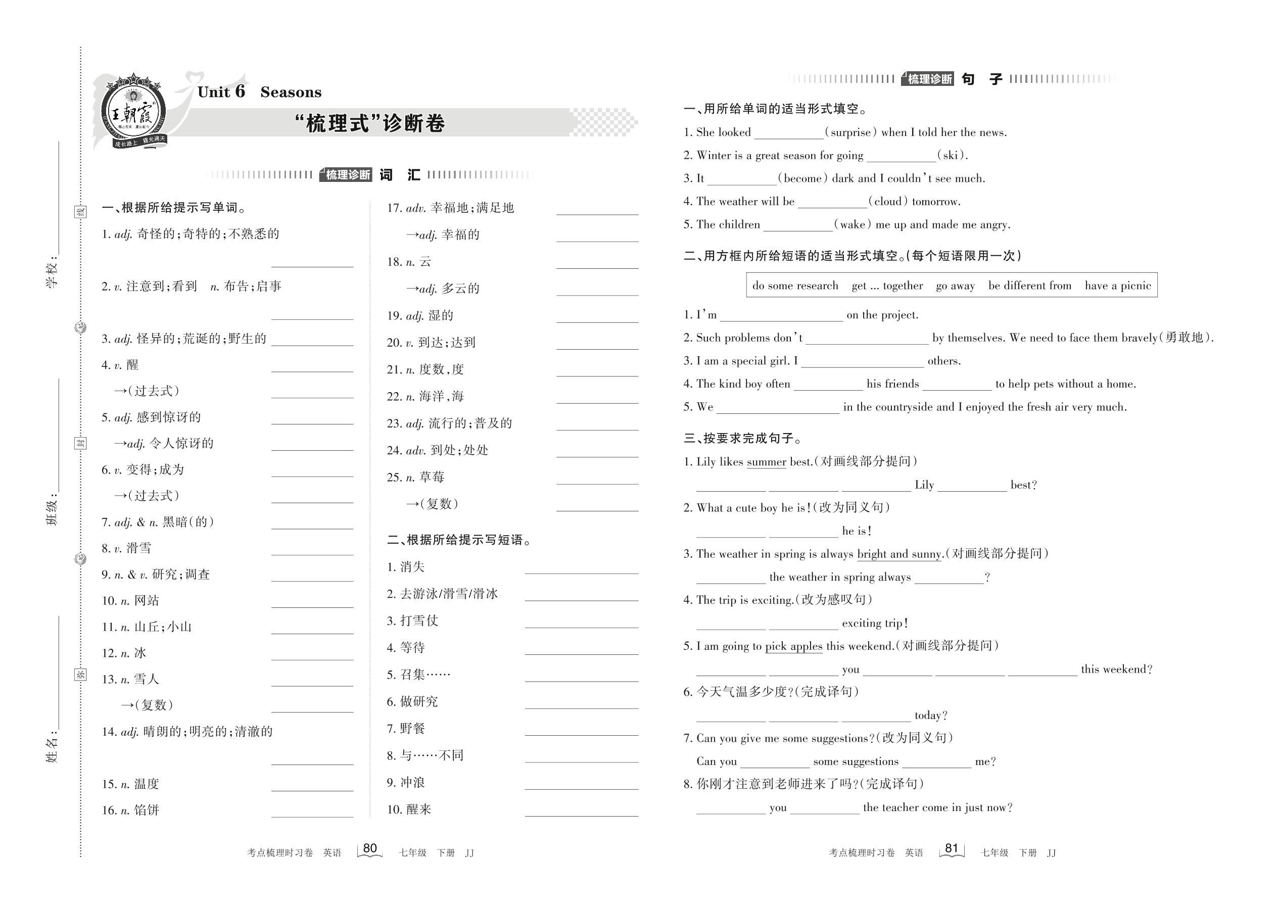 2022下册七年级英语冀教版 Unit 6 “梳理式”诊断卷