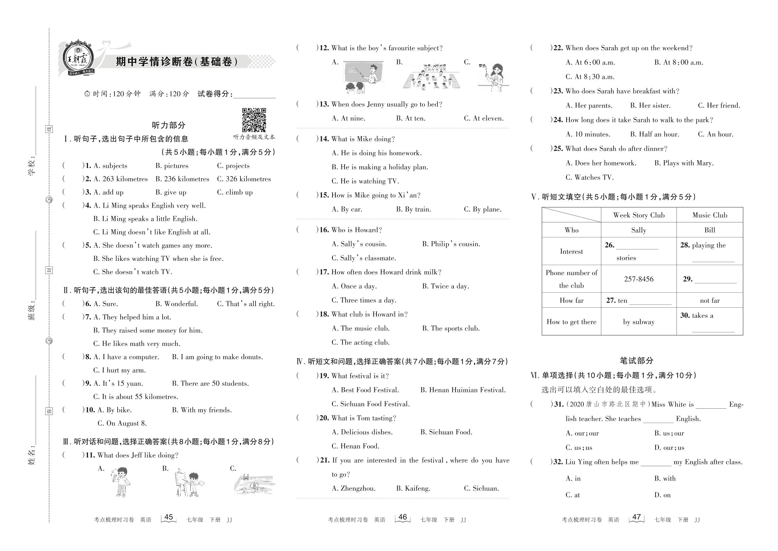 2022下册七年级英语冀教版 期中学情诊断卷(基础卷)