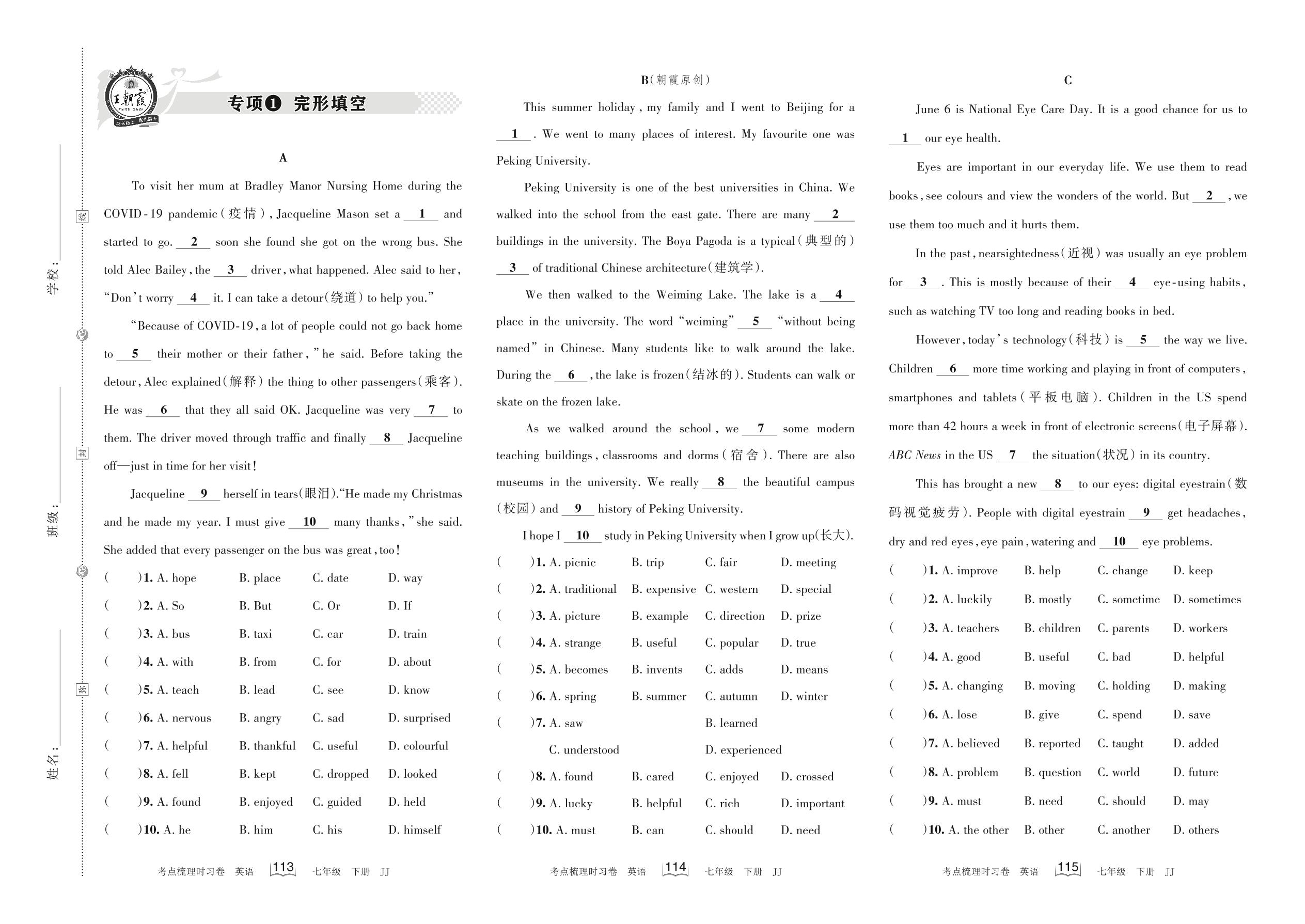 2022下册七年级英语冀教版 专项1 完形填空