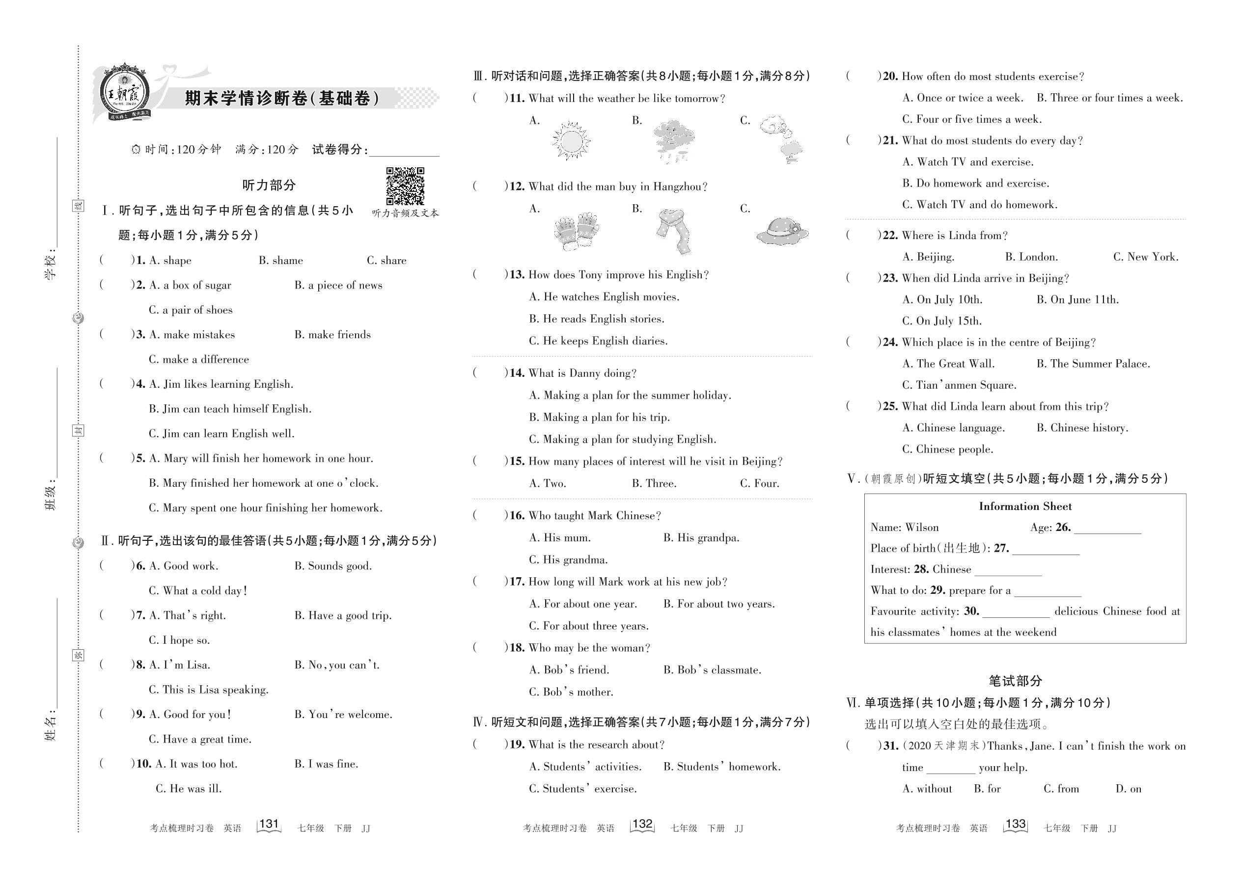 2022下册七年级英语冀教版 期末学情诊断卷(基础卷)