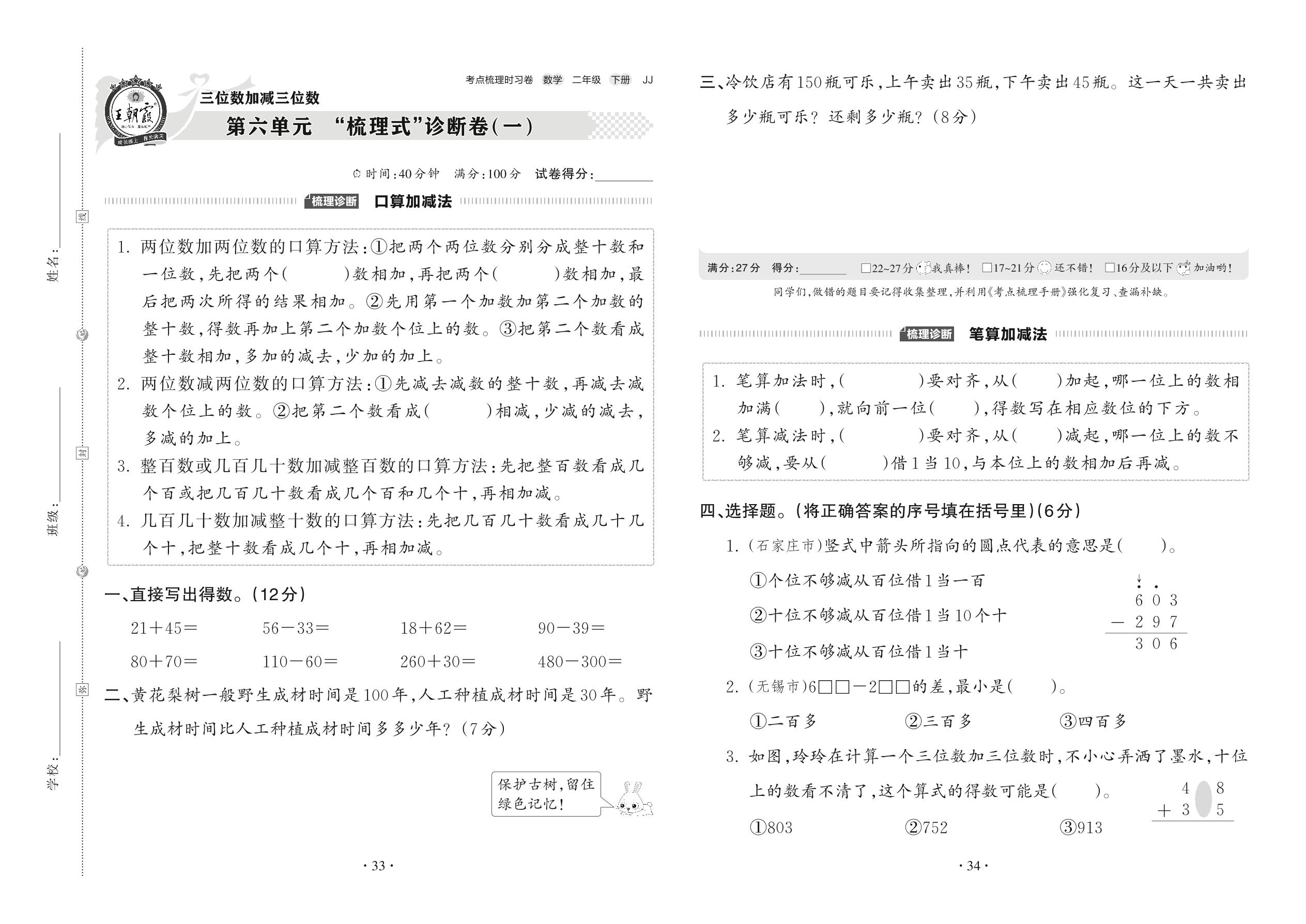 2022下册二年级数学冀教版 第六单元 “梳理式”诊断卷(一)