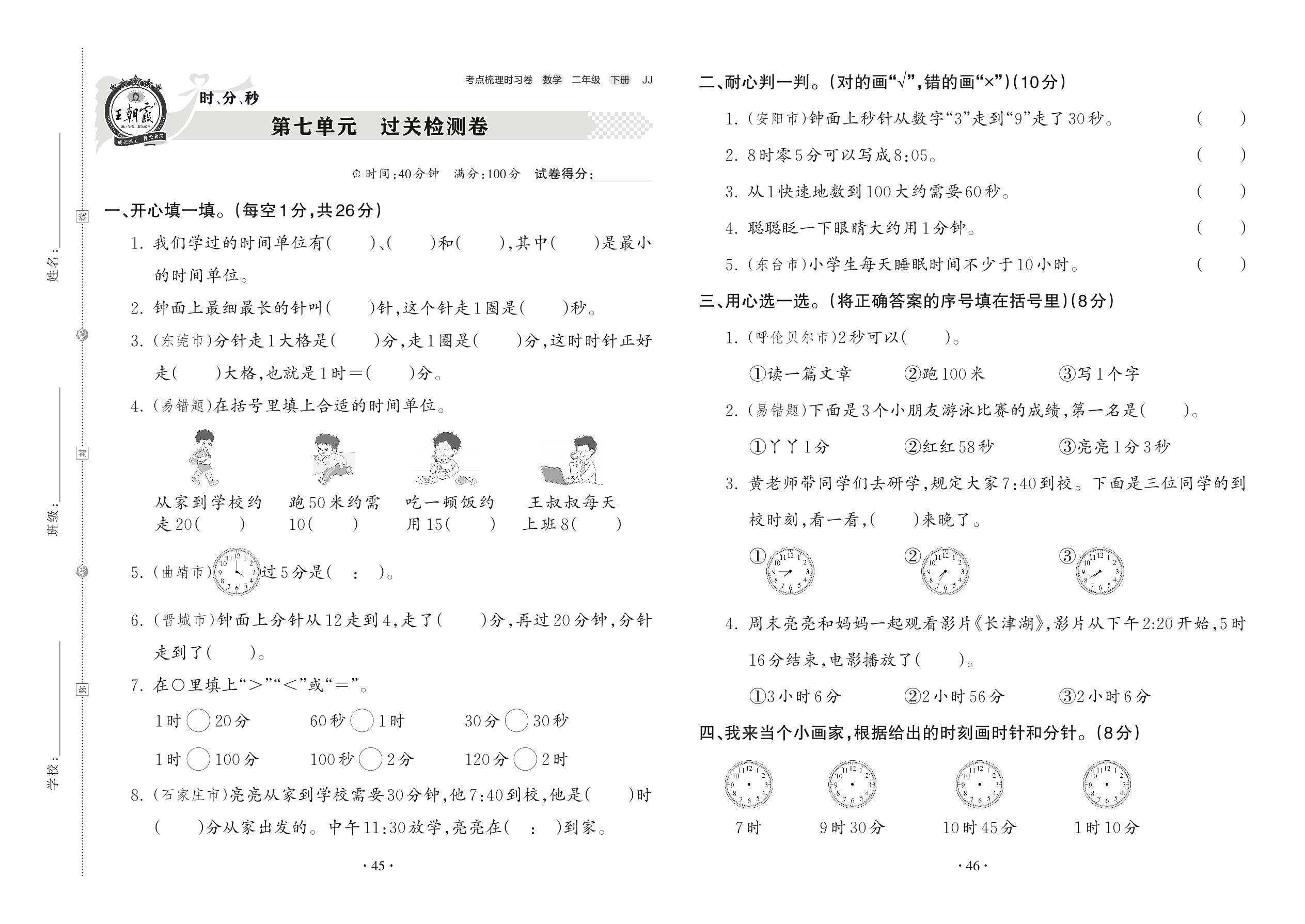2022下册二年级数学冀教版 第七单元 过关检测卷