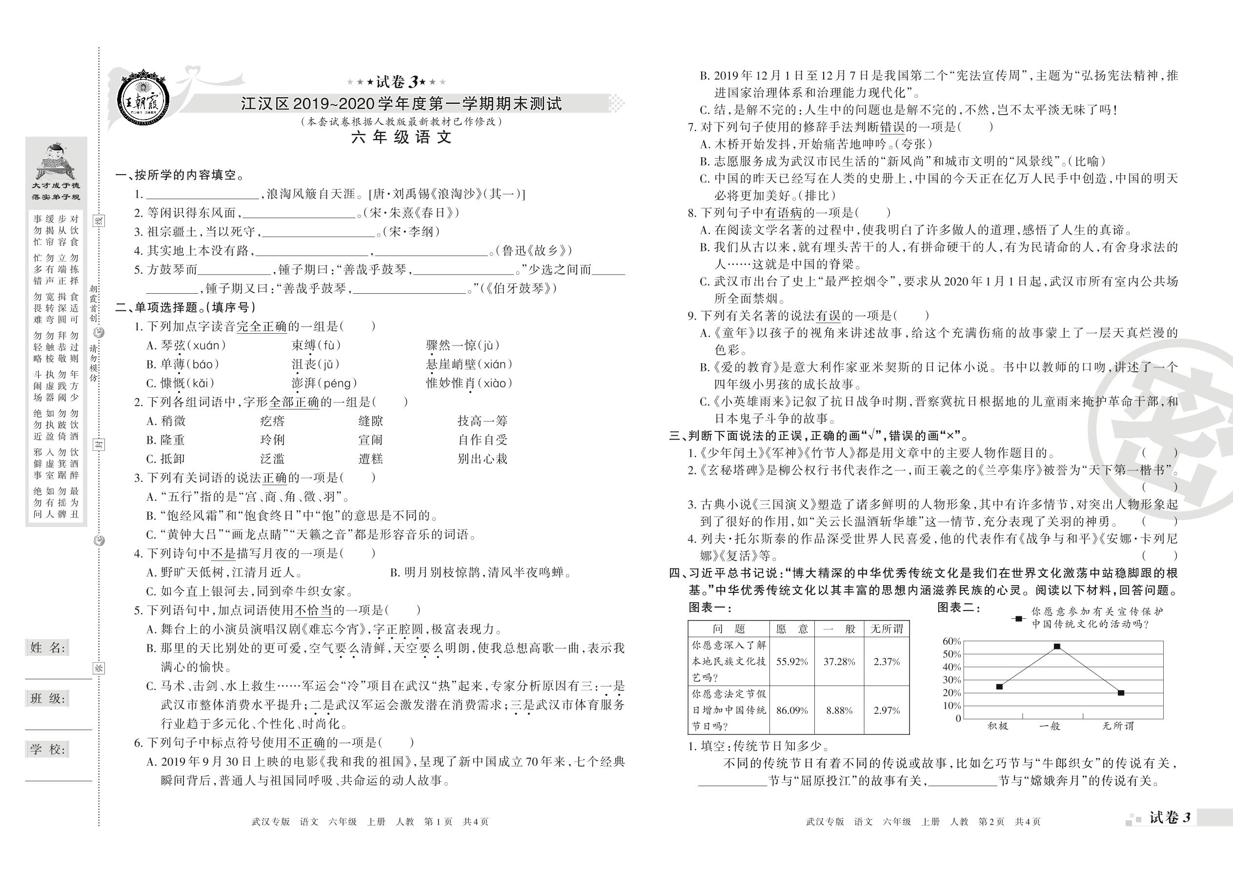 2019-2020学年第一学期武汉市江汉区六年级语文试卷(人教版)【3】
