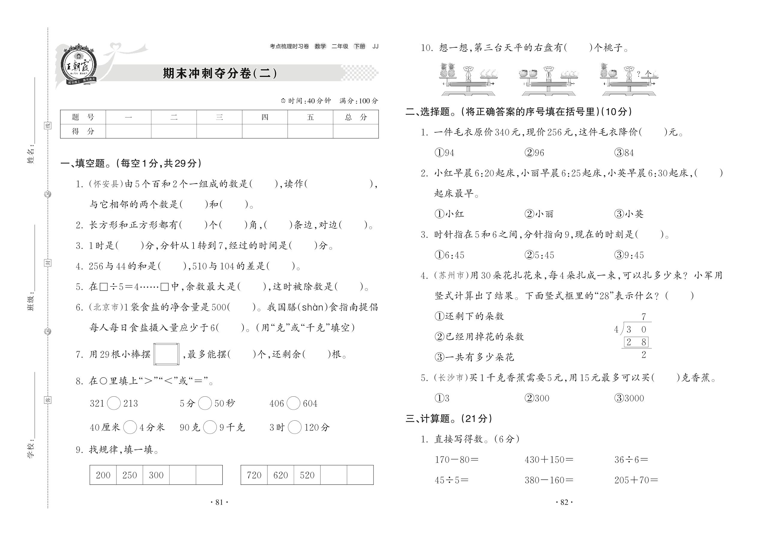 2022下册二年级数学冀教版 期末冲刺夺分卷(二)
