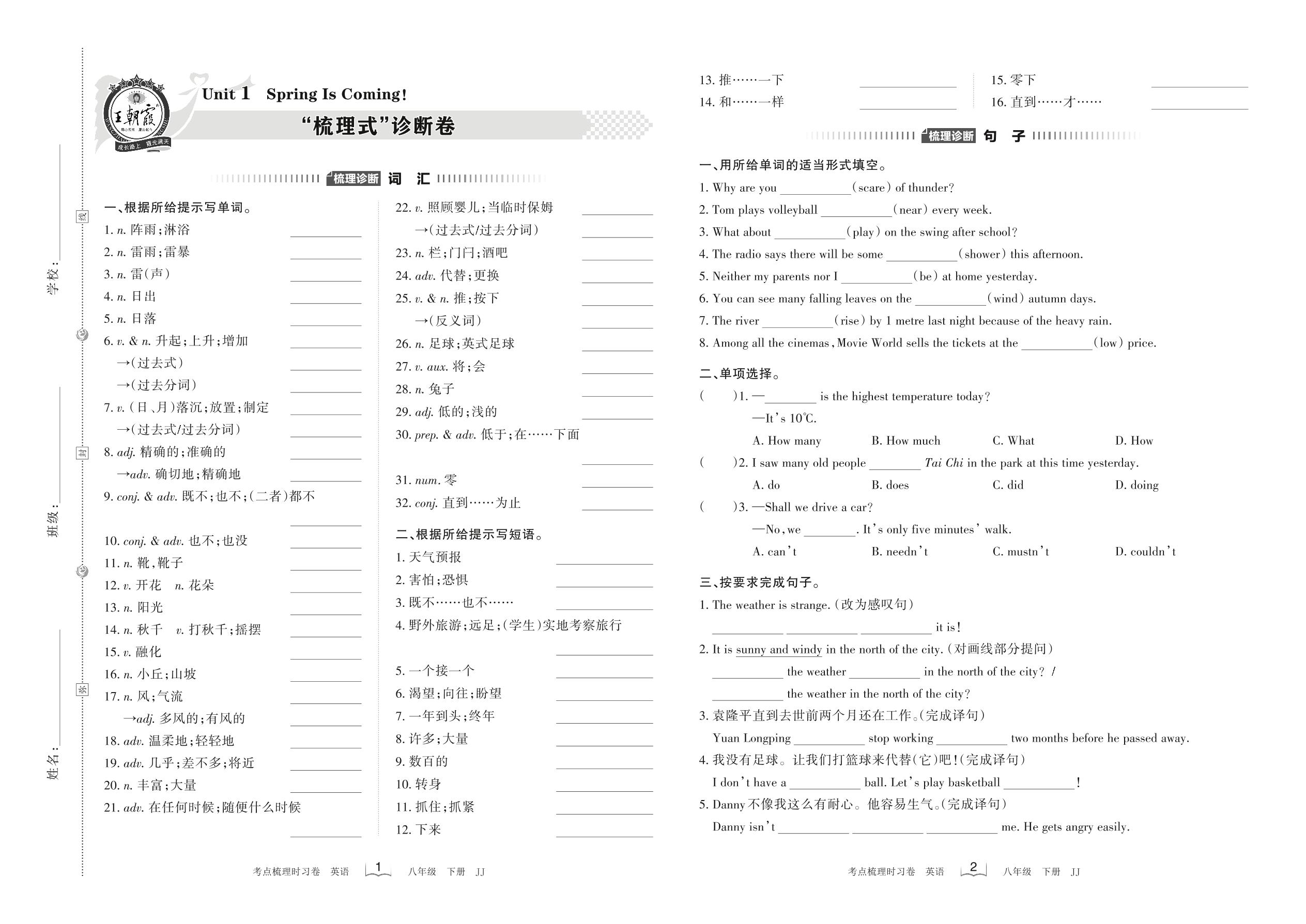2022下册八年级英语冀教版 Unit 1 “梳理式”诊断卷