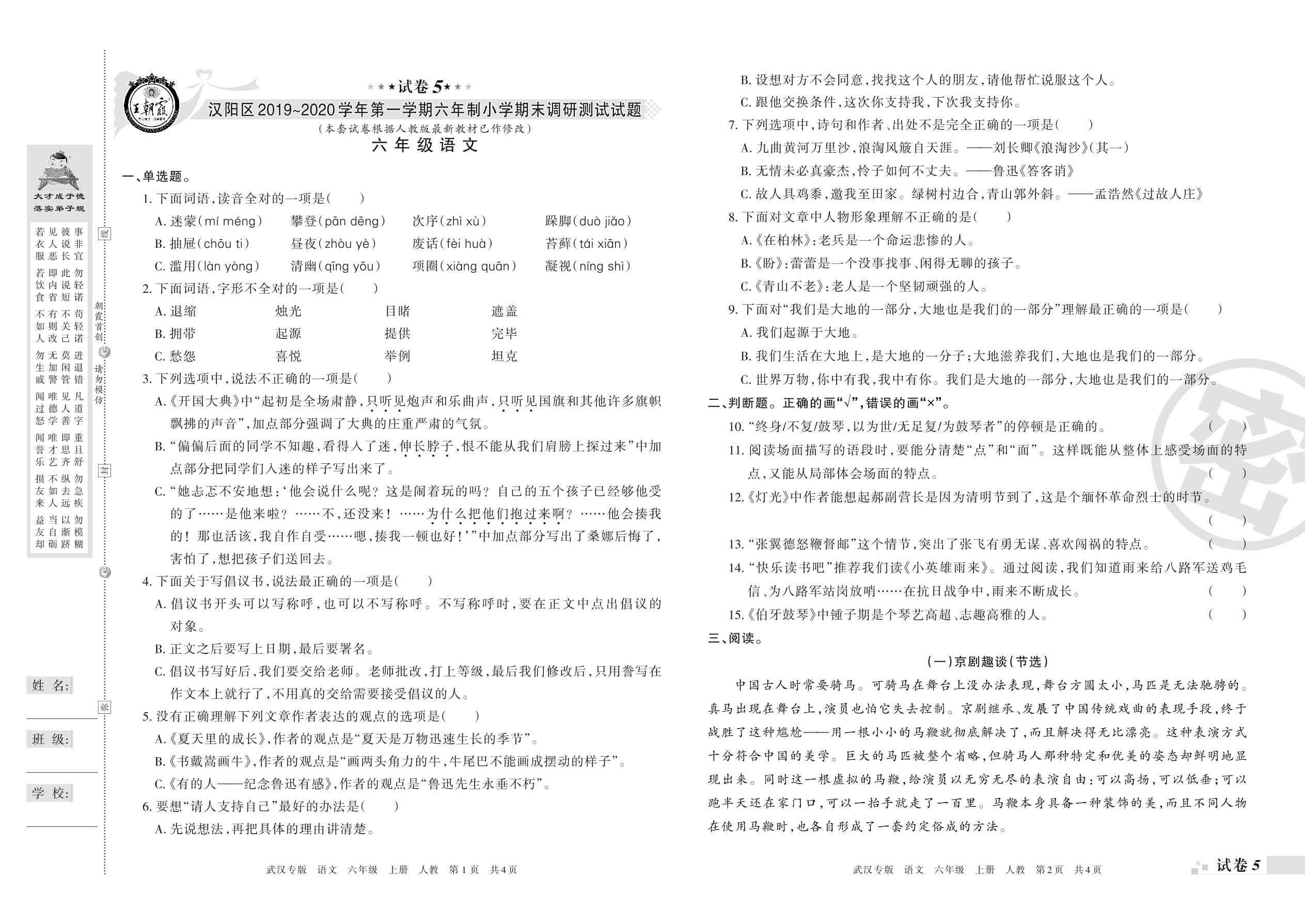 2019-2020学年第一学期武汉市汉阳区六年级语文试卷(人教版)【5】