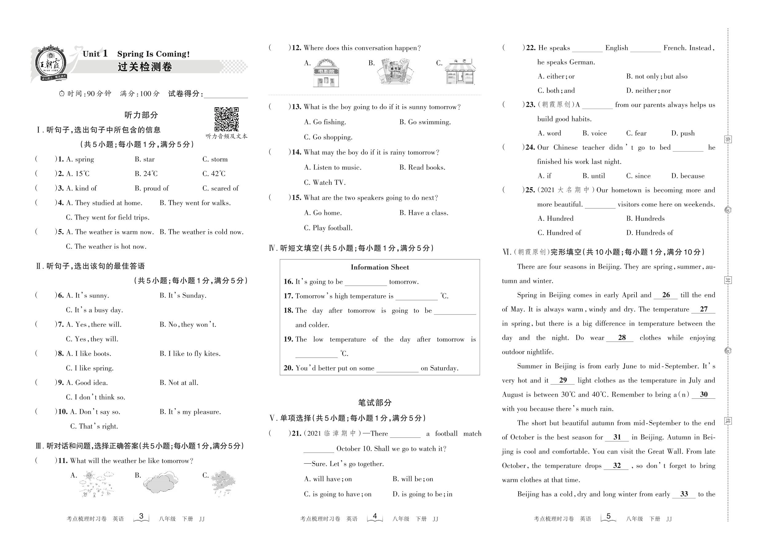 2022下册八年级英语冀教版 Unit 1 过关检测卷